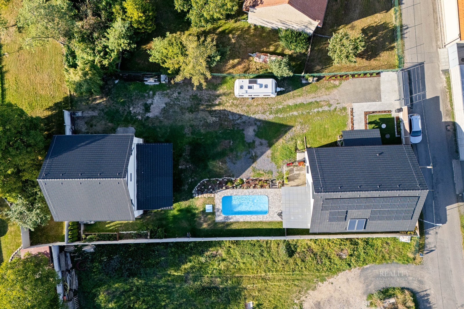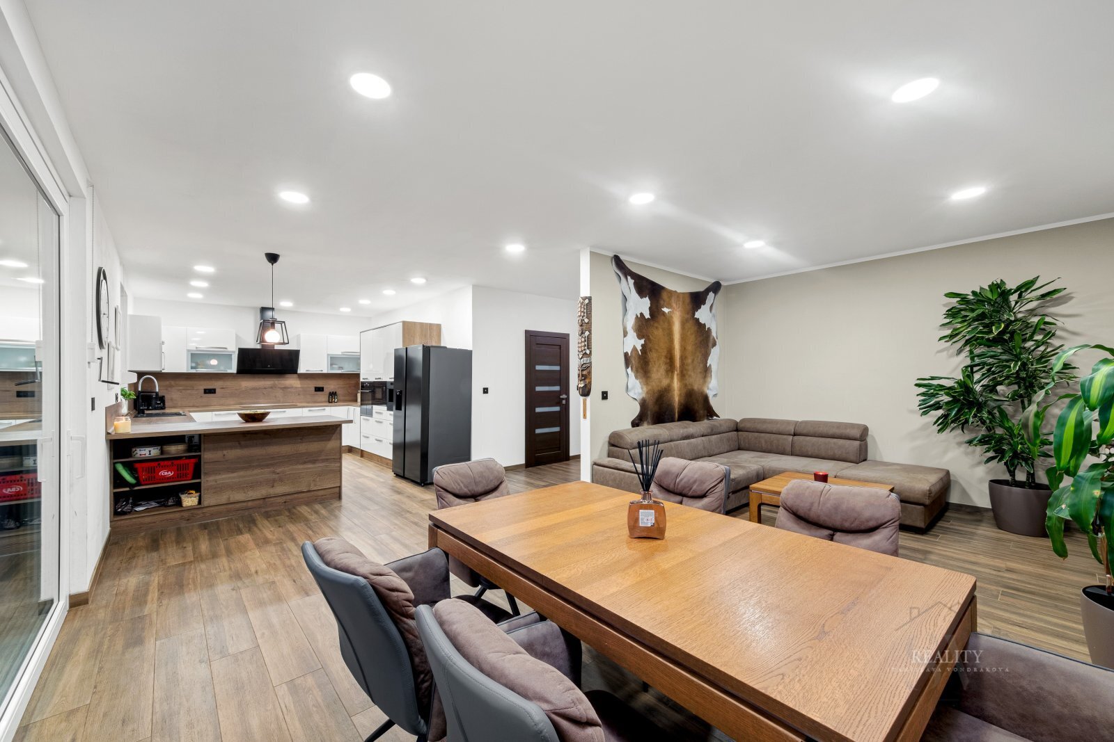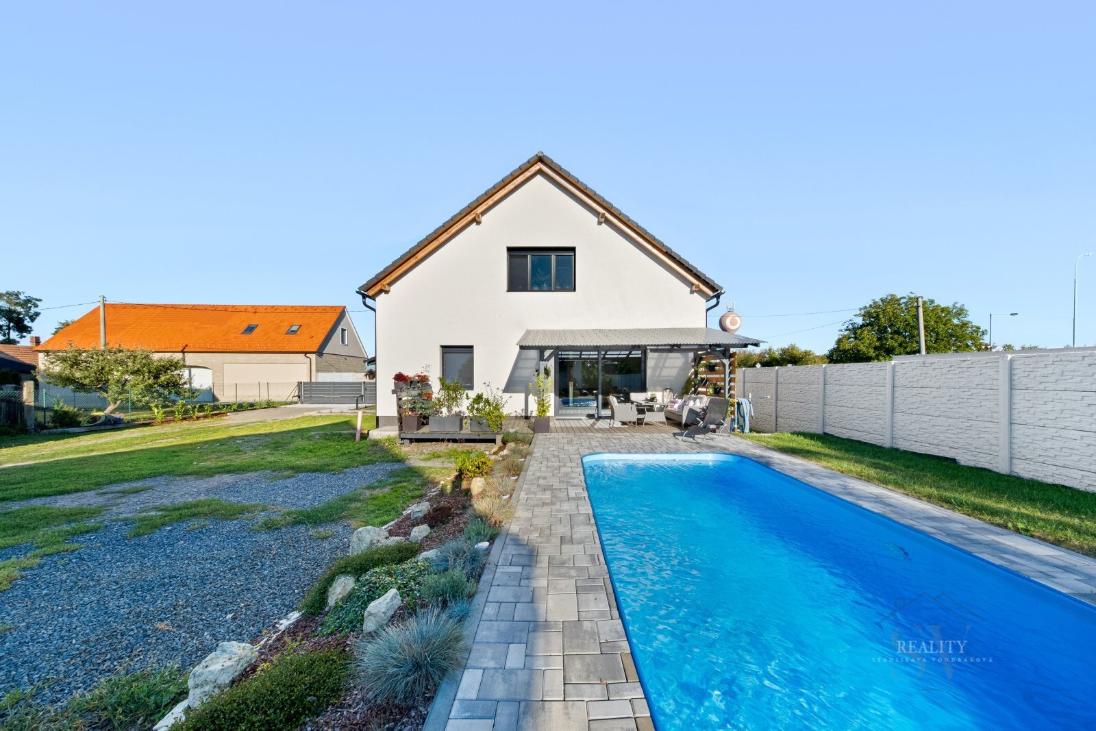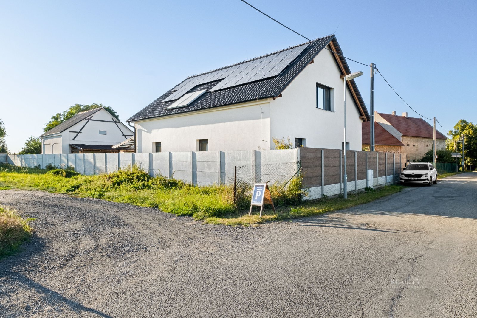 Exkluzivně nabízíme k prodeji moderní novostavbu rodinného domu o dispozici 4+kk, postavenou v roce 2021. Tento dům splňuje všechny nároky na komfortní a současné bydlení. Nemovitost se nachází v klidné části obce Radouň (Mělnické Vtelno), což z ní činí ideální volbu pro rodiny hledající tiché prostředí s výbornou dostupností do Mělníka a okolí. Moderní provedení a praktické uspořádání Dům byl postaven s důrazem na kvalitu a moderní design, který se promítá do každého detailu. Dispozice 4+kk nabízí dostatek prostoru a pohodlí pro rodinný život. Přízemí domu tvoří: vstupní chodba a samostatné WC, prostorný obývací pokoj (44,64 m²) propojený s kuchyňským koutem a přímým vstupem na terasu a k bazénu, moderní kuchyň vybavená vestavěnými spotřebiči značky Electrolux (myčka, varná deska, komínová digestoř s podsvícením, el. trouba, mikrovlnná trouba, kávovar) a americkou lednicí, lesklá kuchyňská linka s velkou pracovní plochou a dřevěným pultem, ložnice se šatnou, pracovna, komora, koupelna se sprchovým koutem a mramorovými umyvadly,technická místnost s tepelným čerpadlem NIBE (voda–vzduch). V celém domě je kvalitní dlažba s podlahovým vytápěním a možností regulace, bezfalcové interiérové dveře s magnetickými zámky, dotykové vypínače, před okenní rolety a trojskla. První patro (89,85 m²) – flexibilní prostor pro bydlení i podnikání Do horního patra vede designové schodiště. Otevřený prostor je možné využít jako: další ložnici, ateliér, pracovnu nebo salon pro masáže, kosmetiku či jiné podnikání. Součástí je samostatná koupelna s WC. Velkou výhodou je možnost rozdělení prostoru na jednotlivé zóny a jeho přizpůsobení konkrétním potřebám. Technické parametry: zateplení: Ytong + tepelná izolace + stříkaná PUR pěna, okna: trojsklo, vytápění: podlahové (elektrické) + tepelné čerpadlo, fotovoltaika: 18 panelů + 2 kolektory pro ohřev vody, napojeno na vodovod, odpad řešen septikem, velmi nízké měsíční náklady: cca 3 000 Kč (voda 1 000 Kč, elektřina 2 000 Kč). Exteriér a další vybavení: krytá pergola s posezením (40 m²) – stavební povolení zajištěno, bazén 7 × 3 m, hloubka 1,5 m, garáž naproti domu (zastavěná plocha 110 m²) – možnost vestavby dalšího patra, ideální např. jako klubovna, pracovna nebo další obytný prostor, celý pozemek je oplocen betonovým plotem, který zajišťuje naprosté soukromí, rozlehlá zahrada s možností venkovního posezení. Ráda vás osobně provedu a ukážu všechny přednosti tohoto domu.