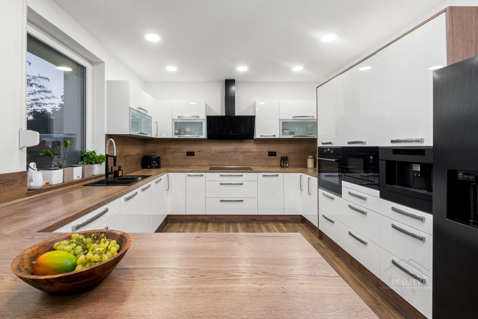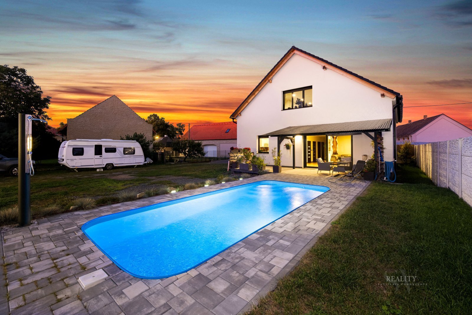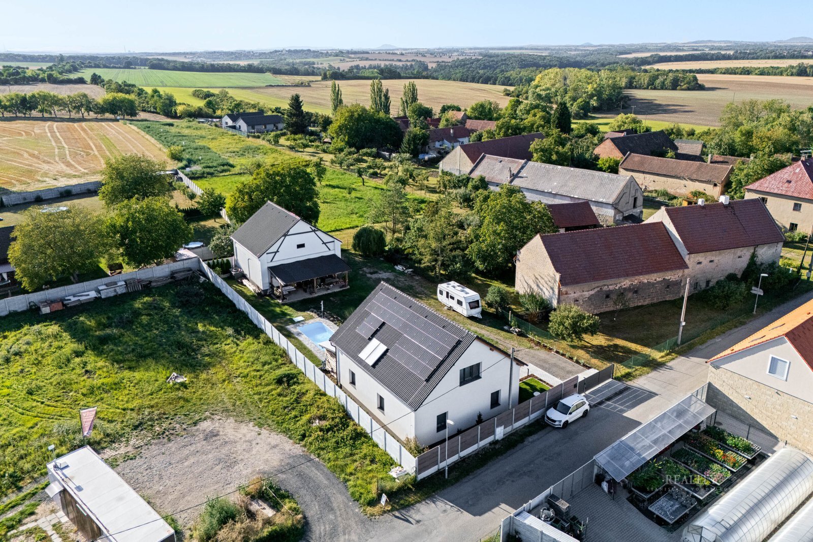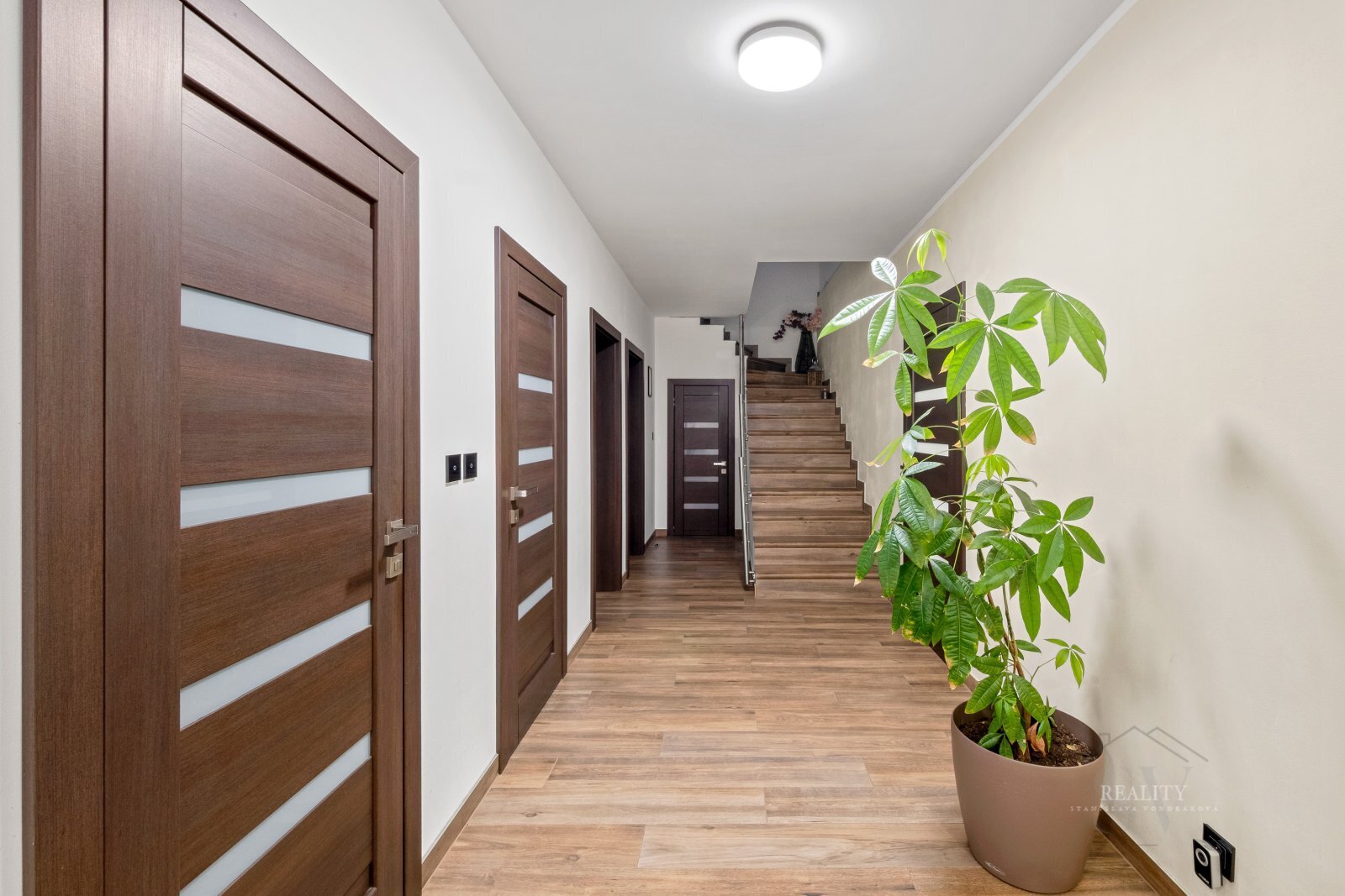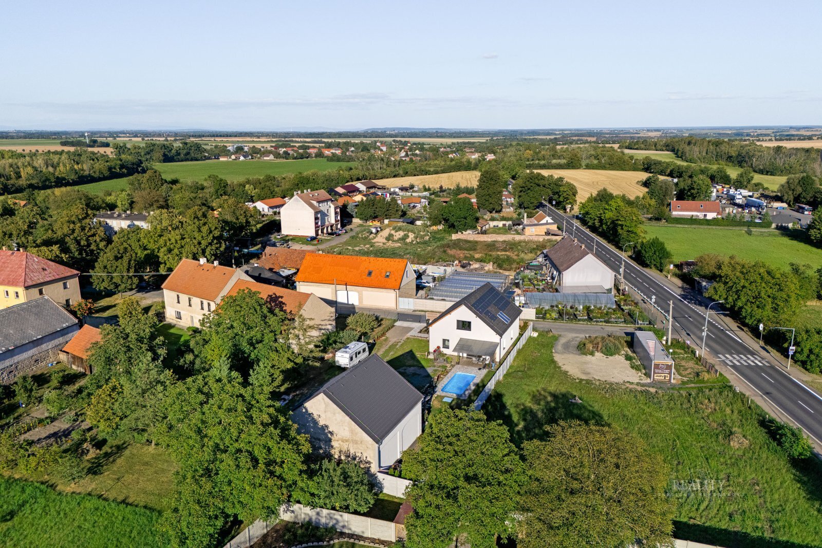 Exkluzivně nabízíme k prodeji moderní novostavbu rodinného domu o dispozici 4+kk, postavenou v roce 2021. Tento dům splňuje všechny nároky na komfortní a současné bydlení. Nemovitost se nachází v klidné části obce Radouň (Mělnické Vtelno), což z ní činí ideální volbu pro rodiny hledající tiché prostředí s výbornou dostupností do Mělníka a okolí. Moderní provedení a praktické uspořádání Dům byl postaven s důrazem na kvalitu a moderní design, který se promítá do každého detailu. Dispozice 4+kk nabízí dostatek prostoru a pohodlí pro rodinný život. Přízemí domu tvoří: vstupní chodba a samostatné WC, prostorný obývací pokoj (44,64 m²) propojený s kuchyňským koutem a přímým vstupem na terasu a k bazénu, moderní kuchyň vybavená vestavěnými spotřebiči značky Electrolux (myčka, varná deska, komínová digestoř s podsvícením, el. trouba, mikrovlnná trouba, kávovar) a americkou lednicí, lesklá kuchyňská linka s velkou pracovní plochou a dřevěným pultem, ložnice se šatnou, pracovna, komora, koupelna se sprchovým koutem a mramorovými umyvadly,technická místnost s tepelným čerpadlem NIBE (voda–vzduch). V celém domě je kvalitní dlažba s podlahovým vytápěním a možností regulace, bezfalcové interiérové dveře s magnetickými zámky, dotykové vypínače, před okenní rolety a trojskla. První patro (89,85 m²) – flexibilní prostor pro bydlení i podnikání Do horního patra vede designové schodiště. Otevřený prostor je možné využít jako: další ložnici, ateliér, pracovnu nebo salon pro masáže, kosmetiku či jiné podnikání. Součástí je samostatná koupelna s WC. Velkou výhodou je možnost rozdělení prostoru na jednotlivé zóny a jeho přizpůsobení konkrétním potřebám. Technické parametry: zateplení: Ytong + tepelná izolace + stříkaná PUR pěna, okna: trojsklo, vytápění: podlahové (elektrické) + tepelné čerpadlo, fotovoltaika: 18 panelů + 2 kolektory pro ohřev vody, napojeno na vodovod, odpad řešen septikem, velmi nízké měsíční náklady: cca 3 000 Kč (voda 1 000 Kč, elektřina 2 000 Kč). Exteriér a další vybavení: krytá pergola s posezením (40 m²) – stavební povolení zajištěno, bazén 7 × 3 m, hloubka 1,5 m, garáž naproti domu (zastavěná plocha 110 m²) – možnost vestavby dalšího patra, ideální např. jako klubovna, pracovna nebo další obytný prostor, celý pozemek je oplocen betonovým plotem, který zajišťuje naprosté soukromí, rozlehlá zahrada s možností venkovního posezení. Ráda vás osobně provedu a ukážu všechny přednosti tohoto domu.