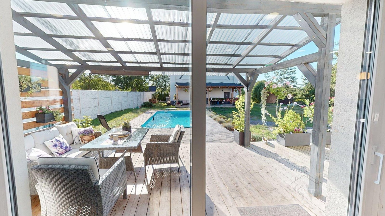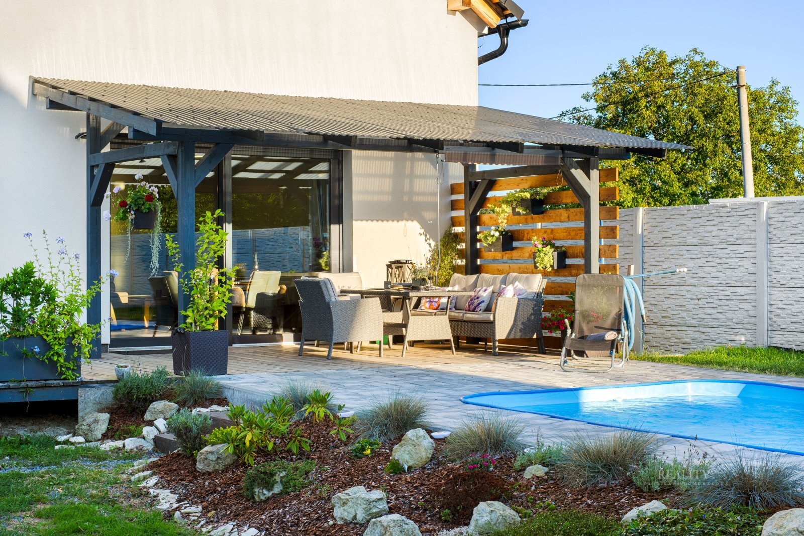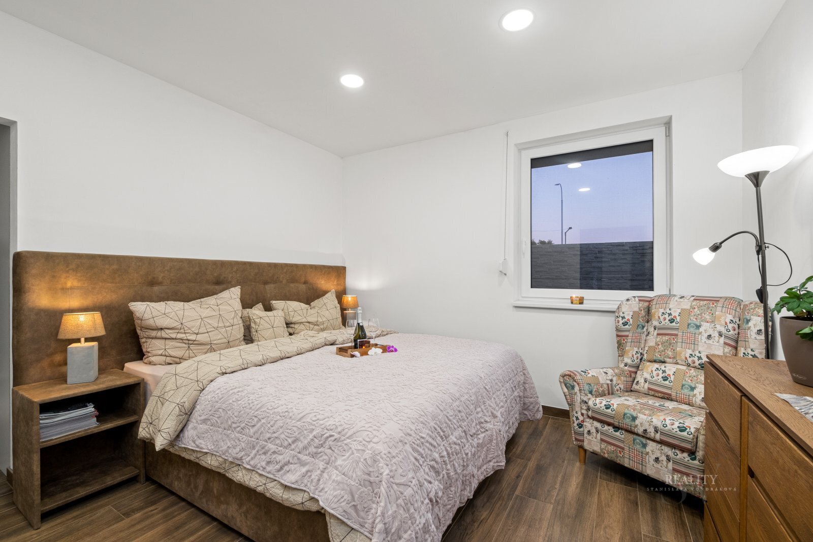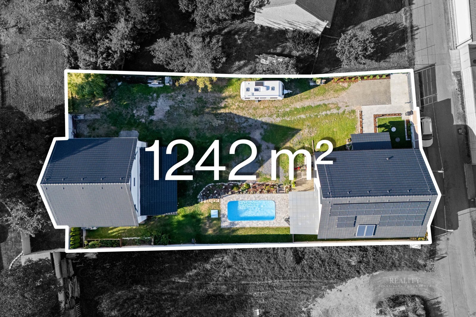 Exkluzivně nabízíme k prodeji moderní novostavbu rodinného domu o dispozici 4+kk, postavenou v roce 2021. Tento dům splňuje všechny nároky na komfortní a současné bydlení. Nemovitost se nachází v klidné části obce Radouň (Mělnické Vtelno), což z ní činí ideální volbu pro rodiny hledající tiché prostředí s výbornou dostupností do Mělníka a okolí. Moderní provedení a praktické uspořádání Dům byl postaven s důrazem na kvalitu a moderní design, který se promítá do každého detailu. Dispozice 4+kk nabízí dostatek prostoru a pohodlí pro rodinný život. Přízemí domu tvoří: vstupní chodba a samostatné WC, prostorný obývací pokoj (44,64 m²) propojený s kuchyňským koutem a přímým vstupem na terasu a k bazénu, moderní kuchyň vybavená vestavěnými spotřebiči značky Electrolux (myčka, varná deska, komínová digestoř s podsvícením, el. trouba, mikrovlnná trouba, kávovar) a americkou lednicí, lesklá kuchyňská linka s velkou pracovní plochou a dřevěným pultem, ložnice se šatnou, pracovna, komora, koupelna se sprchovým koutem a mramorovými umyvadly,technická místnost s tepelným čerpadlem NIBE (voda–vzduch). V celém domě je kvalitní dlažba s podlahovým vytápěním a možností regulace, bezfalcové interiérové dveře s magnetickými zámky, dotykové vypínače, před okenní rolety a trojskla. První patro (89,85 m²) – flexibilní prostor pro bydlení i podnikání Do horního patra vede designové schodiště. Otevřený prostor je možné využít jako: další ložnici, ateliér, pracovnu nebo salon pro masáže, kosmetiku či jiné podnikání. Součástí je samostatná koupelna s WC. Velkou výhodou je možnost rozdělení prostoru na jednotlivé zóny a jeho přizpůsobení konkrétním potřebám. Technické parametry: zateplení: Ytong + tepelná izolace + stříkaná PUR pěna, okna: trojsklo, vytápění: podlahové (elektrické) + tepelné čerpadlo, fotovoltaika: 18 panelů + 2 kolektory pro ohřev vody, napojeno na vodovod, odpad řešen septikem, velmi nízké měsíční náklady: cca 3 000 Kč (voda 1 000 Kč, elektřina 2 000 Kč). Exteriér a další vybavení: krytá pergola s posezením (40 m²) – stavební povolení zajištěno, bazén 7 × 3 m, hloubka 1,5 m, garáž naproti domu (zastavěná plocha 110 m²) – možnost vestavby dalšího patra, ideální např. jako klubovna, pracovna nebo další obytný prostor, celý pozemek je oplocen betonovým plotem, který zajišťuje naprosté soukromí, rozlehlá zahrada s možností venkovního posezení. Ráda vás osobně provedu a ukážu všechny přednosti tohoto domu.
