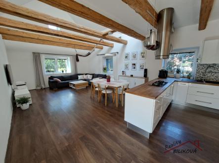 Nabízím k prodeji samostatně stojící rodinný dům na Mělníku, ul. V Kroupovci. Dům se nachází v klidné okrajové části obce. Dům je atypický, který v roce 2009 prošel větší rekonstrukcí. Rekonstrukce - nová střecha na části domu, plastová okna, rozvody vody, elektřiny, podlahy, septik s čističkou. Dispozice domu - veranda, ze které se vstupuje do obývacího pokoje s kuchyňským koutem (43m2) a vstupem do pracovny (ateliéru- 19,6m2). Na verandu navazuje předsíň ze které je samostatný vstup do ložnice (13m2), do dětského pokoje (23m2), koupelna s WC (16,7m2), do technická místnosti (původní koupelna 4,9m2), komory a vstup (schodiště) na půdu. Z půdy je možné další pokoj nebo nová bytová jednotka. Půda o rozloze 80m2. Obývací pokoj s kuchyňským koutem díky otevřenému prostoru působí klidným, rodinným dojmem. V kuchyni - kuchyňská linka včetně vestavěných spotřebičů (lednice, myčka nádobí, varná deska, el. trouba, mikrovlná trouba). Vstup po dřevěném schodišti do pracovny -ateliéru. V dětském pokoji vestavěné skříně, v jedné části skříně se nachází vstup do ložnice, původně zde byla šatna. Vytápění domu je horkovodem, ohřev vody bojlerem. Podlahové topení, kromě ložnice a předsíně. Na pozemku stojí garáž o výměře 28m2. Pozemek je svažitý, oplocen a vstup je možný ze dvou stran. Posuvná vrata u přístřešku za domem a další samostatná vrata z boku zahrady. Pozemek je zčásti vydlážděn. U domu rozlehlá zahrada, která je jako samostatný pozemek o výměře 1228m2. Tento pozemek je v územním plánu veden k bydlení, možnost postavit další dům se samostatným vjezdem. IS-elektřina 220/380V, septik s čističkou, obecní vodovod. Přípojka kanalizace u pozemku. PENB se v současné době zpracovává proto je uváděna třída G.