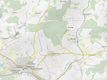 Lesní pozemek o výměře 2102 m2, parcelní číslo 271/58, podíl 1/1, katastrální území Milavče, obec Milavče, obec s rozšířenou působností Domažlice, okres Domažlice, Plzeňský kraj. Po těžbě.