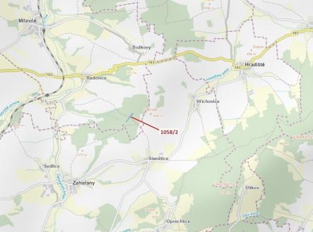 Lesní pozemek o výměře 5 152 m2, parcelní číslo 1058/2, podíl 1/1, katastrální území Radonice u Milavčí, obec Milavče, obec s rozšířenou působností Domažlice, okres Domažlice, Plzeňský kraj. Po těžbě.