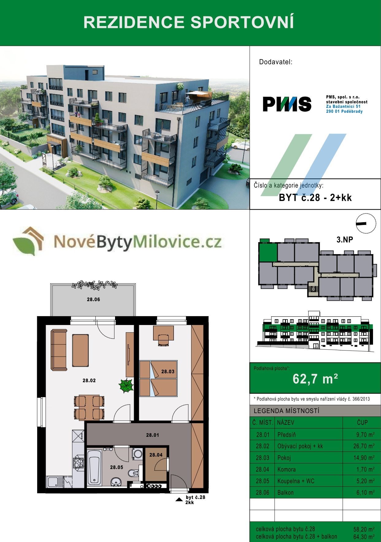 Dobrý den, Dovolte mi představit jeden ze 44 krásných bytů v nově vznikajícím projektu Rezidence Sportovní v Milovicích. Výstavba nyní započala a realizuje ji společnost s dlouholetou tradicí a praxí v oboru, firma PMS Poděbrady. Nabízený byt 2+kk č.28 potěší balkonem 6,1 m², ideálním na ranní kávu či bylinkový truhlík. Obývací pokoj je přímo propojen s kuchyní i jídelnou, takže celý prostor působí vzdušně a pohodlně. V bytě je praktická technická komora, nebo ji můžete využít jako šatnu, to záleží na Vás. Dále prostorná ložnice a také koupelna s vanou a toaletou. Podlahové vytápění se stará o příjemné teplo a více místa bez radiátorů. Samozřejmostí je příprava na předokenní žaluzie. Kolaudace: květen 2027 (předání v létě 2027). Standardy projektu • Každý byt má balkon, terasu nebo předzahrádku • Podlahové topení v celém bytě • Technická komora v každé jednotce • Příprava na předokenní žaluzie • Výtah v domě • Centrální plynová kotelna, která vytápí celý dům a ohřívá vodu • Klientské změny: možnost výběru dekorů vinylových podlah, obkladů a dlažeb, interiérových dveří, výměna vany za sprchu apod. Parkování a sklepy (volitelné dokoupení) • Venkovní parkovací stání: 130 000 Kč • Vnitřní parkovací stání: 250 000 Kč • Vnitřní parkovací stání se sklepem: 300 000 Kč • Samostatný sklep: 90 000 Kč Lokalita Projekt vzniká v Milovicích – klidné lokalitě s výbornou dostupností a veškerou občanskou vybaveností. Více informací o projektu a volných jednotkách najdete na rezidencesportovni cz. Součástí naší nabídky je kompletní servis – právní služby a zajištění všech potřebných dokumentů, pomoc se zajištěním nejvýhodnějšího financování, pojištění nemovitosti i domácnosti. Pro více informací, nebo schůzku se na mě neváhejte obrátit.