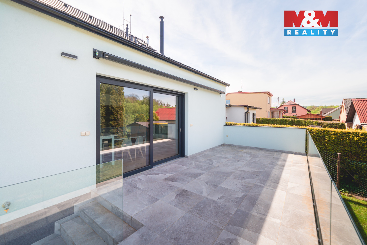 Exkluzivní novostavba zděného patrového rodinného domu o dispozici 5+kk se dvěma koupelnami v klidné části obce Mirošov, v těsné blízkosti Brdských lesů, se zahradou o vel. 487 m2. Dům, je postaven z kvalitních materiálů ve vysokém standardu. Disponuje dubovými podlahami, HS portálem, trojskly, podlahovým topením, bez falcovými dveřmi, krbem v obývacím pokoji, dále plně vybavenou moderní kuchyňskou linkou se spotřebiči (varná deska, digestoř, mikrovlnná trouba, trouba, myčka, lednice s mrazákem). Z obývacího pokoje je také vstup na terasu s markýzou, která nabízí výhled do zahrady. Před domem jsou k dispozici tři parkovací místa. Součástí je také zahradní domek o rozměrech 2,5x 5 m. V obci Mirošov naleznete veškerou občanskou vybavenost jako je ZS, MŠ, zdravotní centrum, poštu, obchody, autobusové i vlakové spojení. Nájezd na dálnici D5 vzdálen 8 km. Kompletní dokumentace k dispozici na prohlídce.