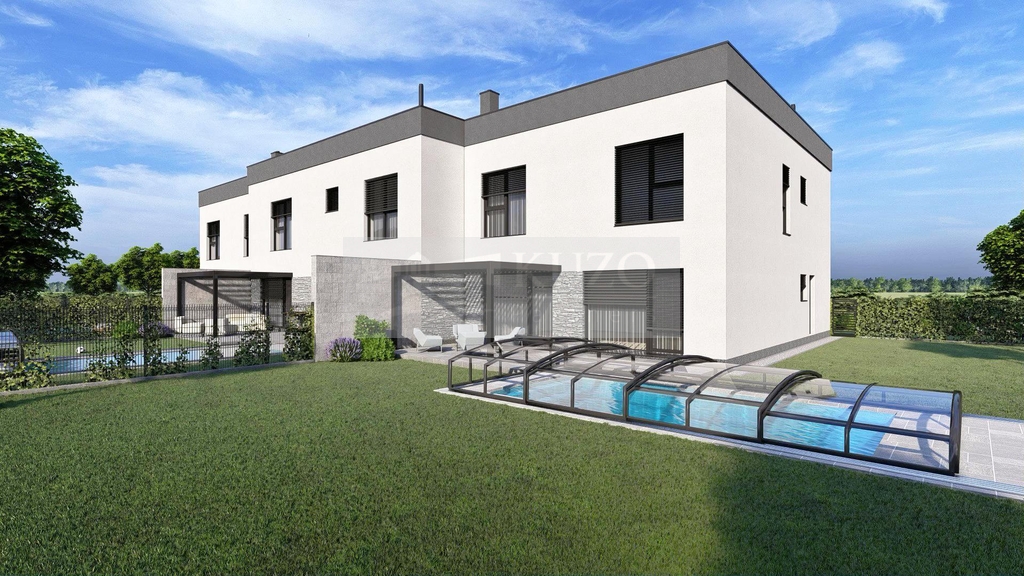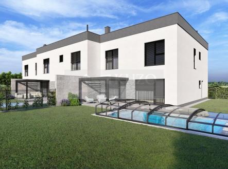 Líbilo by se Vám žít ve městě, a přesto být obklopeni přírodou? Chcete se stát součástí skvěle navrženého projektu, díky kterému máte přírodu doslova pár kroků za domem? V moderní a prakticky řešené vile, najdete krajní bytovou jednotku o dispozici 5+kk a komfortních 168 m2 vnitřní užitné plochy ve dvou podlažích. Podlahová plocha jednotky je 179 m2. Součástí jednotky je garáž a k tomu navíc je před vilou další soukromé parkovací stání. V okolí domu si budete užívat privátní rovinatou zahradu o výměře 394 m2, která navazuje na venkovní terasu. Celková výměra pozemku, který náleží k této jednotce je 557 m2. V přízemí se nachází prostorný obývací pokoj s kuchyňským koutem, který má téměř 40 m2. Dále je zde vstupní předsíň, samostatná toaleta s místem pro pračku a sušičku, garáž s technickým zázemím. Po schodišti do prvního patra, jsou čtyři samostatné pokoje, koupelna se sprchovým koutem a toaletou. Komfort hlavní ložnice navíc ještě umocňuje navazující koupelna s vanou a toaletou a dále také oddělená šatna. Kostru stavby domu tvoří železobetonová nosná konstrukce. Obvodové výplně železobetonového skeletu a konstrukce příček jsou provedeny z pórobetonových tvárnic. Fasáda je zateplená kontaktním zateplovacím systémem z polystyrenu a na jejím povrchu je tenkovrstvá minerální omítka. Plochou zateplenou střechu opatřenou hydroizolací, kryje zásyp z kačírku. Podlahy všech obytných místností jsou vinylové, v koupelnách a WC je kvalitní keramická dlažba. V garáži je betonová stěrka. Stěny vnitřních omítek jsou štukové, v koupelnách a na WC je keramický obklad. Stropy obytných místností, koupelen a WC mají sádrokartonové podhledy. Mimo vybrané materiály, máte možnost dům na přání vybavit nadstandartními prvky, které si u našich subdodavatelů vyberete. Nízkoenergetická budova je nadstandardně technicky vybavená. Po celém domě je podlahové topení, které obsluhuje kondenzační plynový kotel. Všechna okna s izolačním trojsklem mají přípravu na zatemňovací předokenní rolety. Garáž se zavírá zateplenými sekčními vraty na dálkové ovládání. Dle průkazu energetické náročnosti budovy, jde o objekt s velmi nízkou spotřebou energie. Energetická náročnost budovy třídy B – velmi úsporná, přičemž celková dodaná energie 92 kWh/(m2.rok), řadí jednotku do kategorie A. Jde skutečně o výjimečné bydlení, prakticky na konci slepé ulice, v krásné příměstské lokalitě Chrást u Mladé Boleslavi. Do této lokality v severní části zasahuje přírodní památka Bezděčín a půl kilometru jižně od obce, se nabízí přírodní památka Lom u Chrástu. Vysoká občanská vybavenost města Mladá Boleslav a výhody příměstské dopravy, kde linky MHD pravidelně zajišťují autobusové spojení přímo do příměstské části Chrást, splňují vysoké nároky zájemců o rodinné bydlení. V neposlední řadě určitě stojí za zmínku skvělá dostupnost hlavního města Prahy, kde jste v centru pohodlnou dálniční jízdou po D10, za necelou hodinu jízdy autem. Černý Most stíháte za pouhých 20 minut.