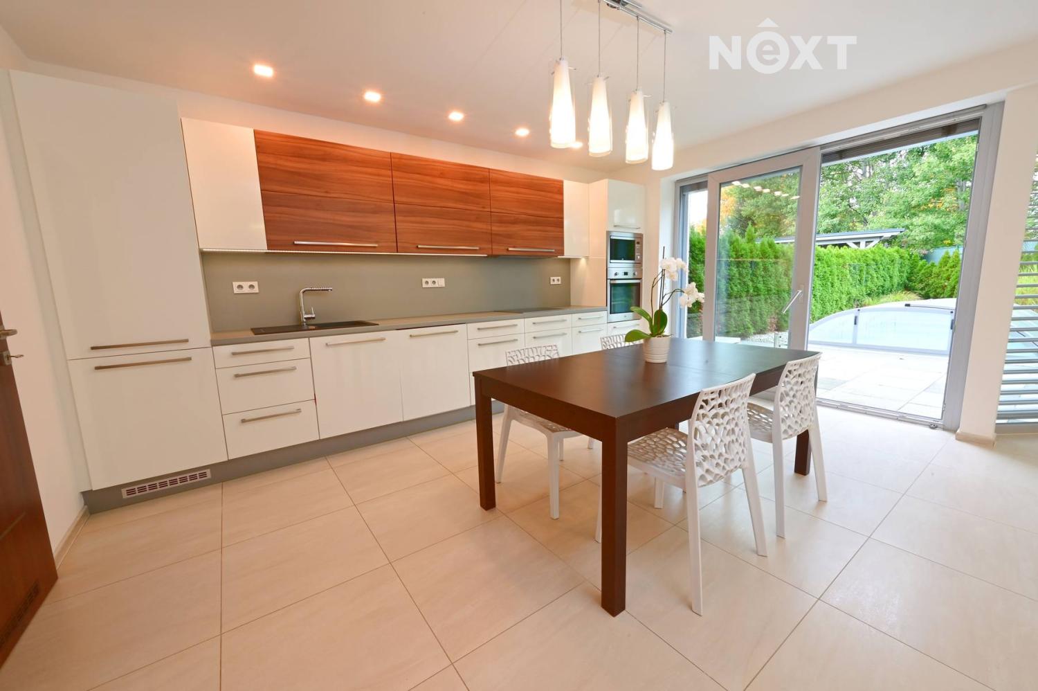 Dovoluji si Vám nabídnout k pronájmu moderní krajní řadový rodinný dům o dispozici 5+kk a celkově užitné ploše 160 m² , který se nachází v klidné části Mladé Boleslavi, ve Svojsíkově ulici, v těsné blízkosti lesoparku Radouč . Tento částečně vybavený dům je ideální volbou pro klienty, kteří hledají komfortní bydlení s dostatkem prostoru, soukromí a moderního zázemí. Dispozice domu: V přízemí se nachází vstupní zádveří s vestavěnou skříní, vstup do garáže (s úložným prostorem), koupelna se sprchovým koutem a toaletou. Dominantou přízemí je prostorný a světlý obývací pokoj s přímým vstupem na terasu a zahradu . Součástí přední části je moderní kuchyňská linka s vestavěnými elektrospotřebiči a jídelním stolem se čtyřmi židlemi. Dále v přízemí naleznete praktickou špíz. V 1. patře domu se nachází čtyři světlé ložnice, dále koupelna s WC ( vybavená vanou) . Podlahové krytiny tvoří plovoucí podlahy, v koupelnách a na toaletách je položena keramická dlažba. Vybavení a technické parametry • vytápění domu zajišťuje tepelné čerpadlo (v celém domě je podlahové vytápění ) • venkovní rolety • připojení na PCO (pult centrální ochrany) , • optická internetová přípojka od společnosti DRAGON • garáž s úložným prostorem a vraty na dálkové ovládání • zahrada s dvěma terasami a zavlažovacím systémem • venkovní zastřešený bazénem s nočním osvětlením a protiproudem. Platební podmínky: • měsíční nájemné je ve výši 47.000,-Kč a zahrnuje zálohy na vodu, elektřinu, topení, pravidelný úklid domu 1× za 14 dní, připojení na PCO, optický internet a svoz komunálního odpadu ( 1x týdně) • vratná kauce (peněžní jistota): 47.000,- Kč , • provize realitní kanceláře za zprostředkování pronájmu činí 30.000,- Kč . Nabízený pronájem je ihned k nastěhování a nabízí vysoký standard bydlení, dostatek úložného prostoru, soukromí a příjemné prostředí v blízkosti přírody. Tento pronájem je ideální pro rodiny či klienty, kteří hledají moderní, prostorný a energeticky úsporný dům v klidné části města, s výbornou dostupností do centra Mladé Boleslavi i na dálnici D10 směrem na Prahu. Pro komunikaci uvádějte evidenční číslo zakázky N114547.