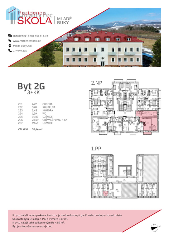 Exkluzivně nabízíme prodej bytu 3+kk s užitnou plochou 76,44m2 byt se nachází v moderním rezidenčním projektu v centru obce Mladé Buky. Nově zrekonstruovaná budova "staré školy" se přeměnila na bytový dům s 28 byty. Dům s výtahem zajišťuje pohodlné bydlení pro všechny věkové skupiny. Díky kvalitnímu provedení a nízkým nákladům na provoz nabízí ideální podmínky pro každodenní život. Byt je navržen s důrazem na komfort a funkčnost. Byt se nachází ve 2.NP s balkónem orientovaným na severovýchod a výhledem na Krkonoše, parkovací stání a sklep jsou samozřejmostí. Nabízí se i možnost dokoupení garáže. Atraktivní lokalita a vysoká poptávka po ubytování zaručují výhodnou investici. Byty jsou ideální pro trvalé bydlení, dlouhodobý pronájem či rekreační využití, což umožňuje stabilní příjmy. Mladé Buky jsou malebnou obcí s výjimečnou polohou mezi městem Trutnov a horskými středisky Krkonoš. Pouhých 15 minut od Trutnova a 20 minut od Pece pod Sněžkou nabízí snadný přístup ke všem potřebným službám, stejně jako k lyžařským areálům, turistickým trasám či golfovému hřišti. V bezprostřední blízkosti se nachází nejen přírodní krásy, ale i široká škála volnočasových aktivit. Mladé Buky jsou ideálním místem pro klidný život, rekreaci i aktivní odpočinek. Neváhejte nás kontaktovat pro více informací či prohlídku bytu.
