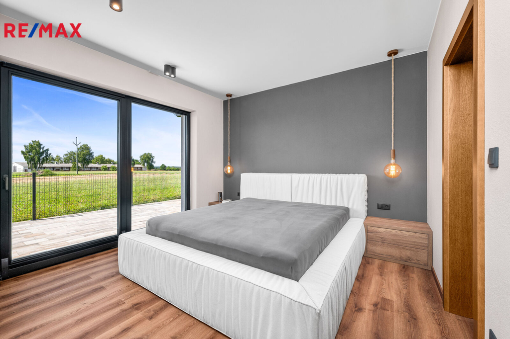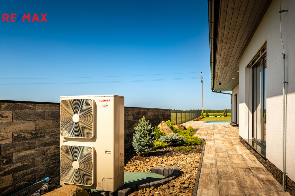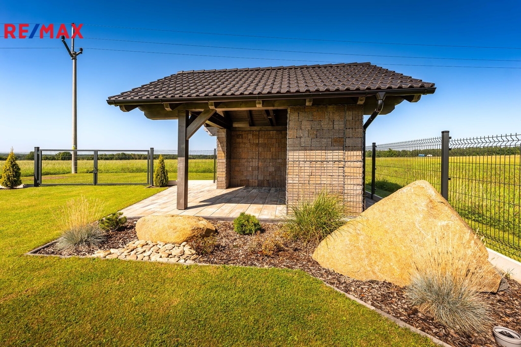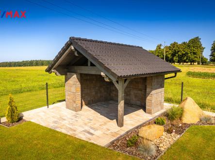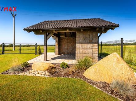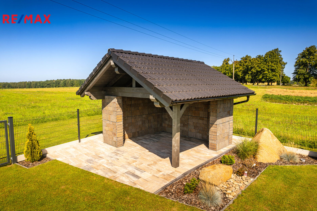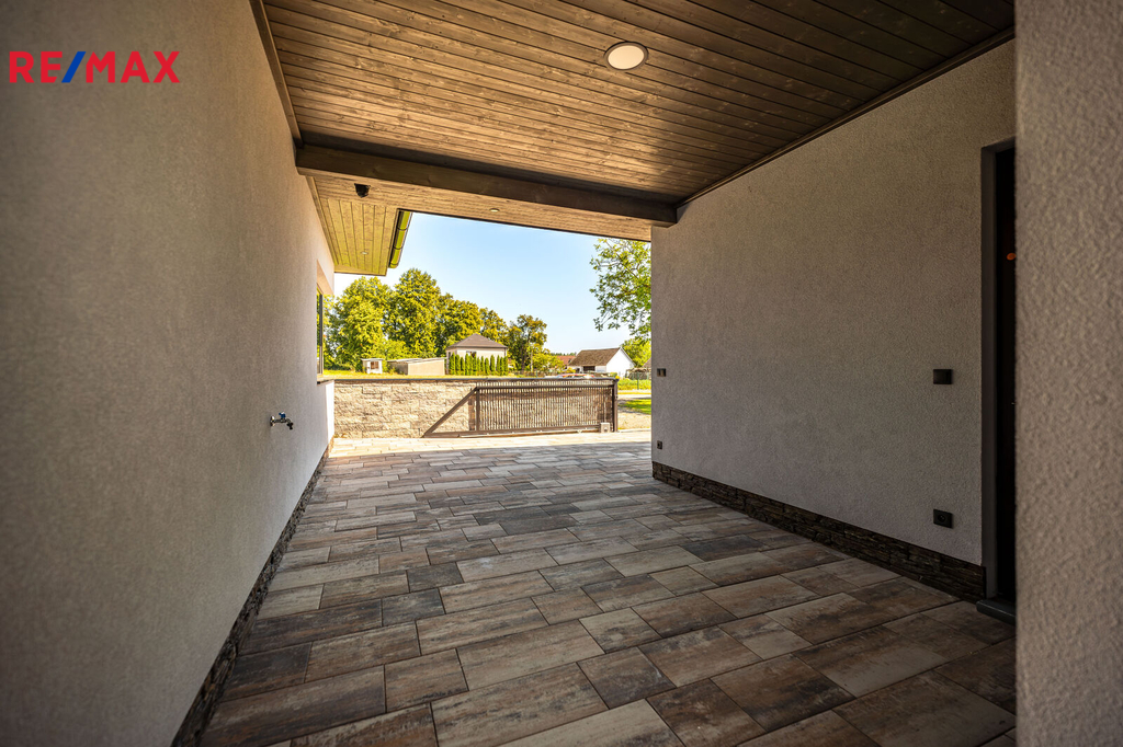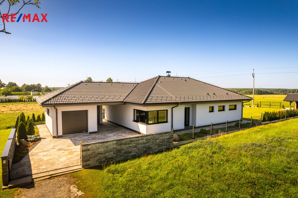 Nabízíme k prodeji nadstandardně provedenou, zatím neobývanou novostavbu přízemního rodinného domu v obci Mladošovice, vzdálené 9 km od Třeboně a 6,5 km z Borovan. Součástí pozemku o celkové výměře 912 m2 je samostatný, nepodsklepený rodinný dům typu bungalov se samostatnou garáží se skladem o celkové zastavěné ploše 192 m2. Prostor mezi garáží a domem je zastřešen a vznikl zde tak prostor pro parkování dalšího vozu. Součástí nemovitosti je také zastřešená pergola umístěná v zadní části zahrady a krytý venkovní bazén navazující na vydlážděnou terasu obklopující celý dům. Obytná část je dispozičně řešena jako 3+kk o podlahové ploše 128,4 m2 a sestává se z chodby, prostorného obývacího pokoje s krbovými kamny, kuchyňským koutem a spíží, pokoje, ložnice se šatnou, koupelny s vanou a sprchovým koutem, samostatného WC, druhé koupelny se sprchovým koutem, s WC a prostorem na pračku se sušičkou. Součástí je také technická místnost, z níž je vstup stahovacím schodištěm do podkroví, kde je ve středové části půdy připraven prostor pro uskladnění věcí, popř. by zde bylo možné zřídit jeden další pokoj. Dispoziční řešení domu s rozměry jednotlivých místností části najdete na přiloženém půdorysu. Nemovitost se prodává včetně nadstandardního, velice kvalitního vybavení: kuchyňská linka se spotřebiči, na míru zhotovený dřevěný nábytek (vestavné šatní skříně v chodbě, úložný systém ve spíži a šatně, koupelnový nábytek, předsíňová stěna, patrová postel vč. stolu a skříně v pokoji, skříně v garáži aj.). V domě zůstane i další vybavení, které je vidět na fotografiích včetně osvětlení. Na oknech v obývacím pokoji a ložnici jsou předokenní žaluzie, podlahové krytiny tvoří lepený vinyl a dlažba, dům má zabezpečovací systém. Postaven je z cihelných bloků Porotherm 44 cm, vybaven kvalitními dřevěnými dveřmi i okny (trojsklo). Vytápění je řešené ústředními, podlahovými rozvody, zdrojem je tepelné čerpadlo vzduch-voda. V obývacím pokoji jsou krbová kamna, která jsou obsluhována z technické místnosti. Ohřev vody zajišťuje 300 l kombinovaný bojler (tepelné čerpadlo a elektřina). Objekt je napojený na obecní přípojku vodovodního řadu, kanalizace je řešena vlastní čistírnou odpadních vod s přepadem do kanalizace. Dešťová voda je svedena do dvou retenčních nádrží, ze kterých je následně řešena závlaha zahrady. Pozemek je kompletně oplocen, přístup je po zpevněné cestě a vjezd bránou na el. pohon. Zahrada je osázená okrasnými dřevinami a součástí je zastřešený bazén (6 x 3,8 x 1,4 m). Tento rodinný dům nebyl primárně stavěn na prodej, byl kladen důraz na kvalitní provedení i vybavení, což je jeho hlavní předností. Další výhodou je umístění na úplném okraji zástavby s výhledem do otevřené krajiny. V obci je obchod, mateřská škola, pohostinství. Komplexní občanská vybavenost je pak v Borovanech nebo v Třeboni. Mladošovice jsou dostupné pravidelným autobusovým spojem (Č. Budějovice – Borovany – Třeboň) .