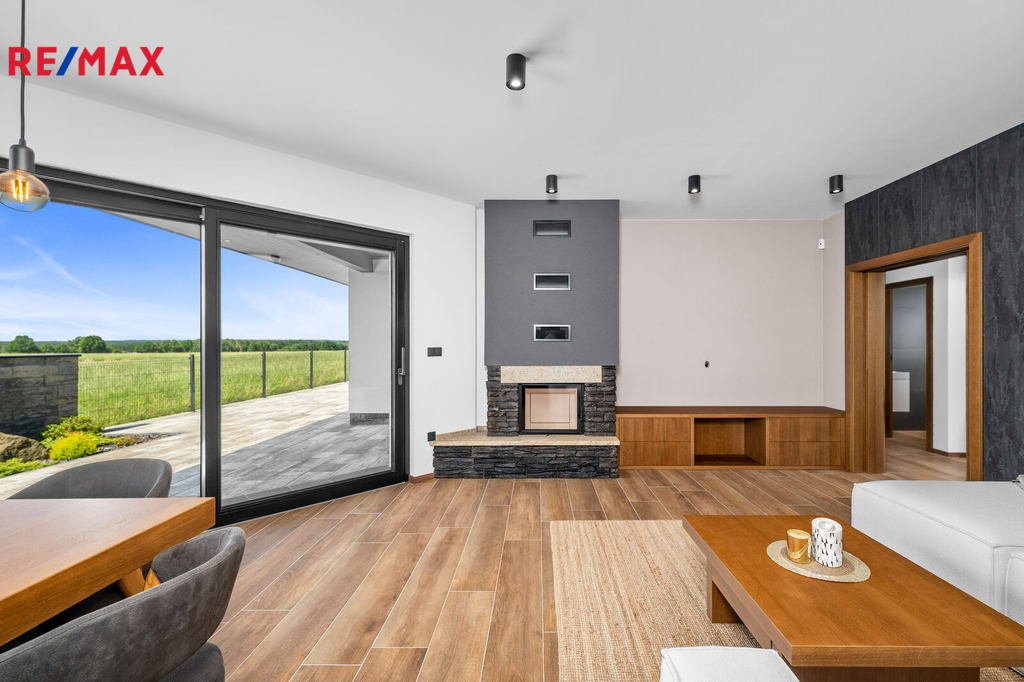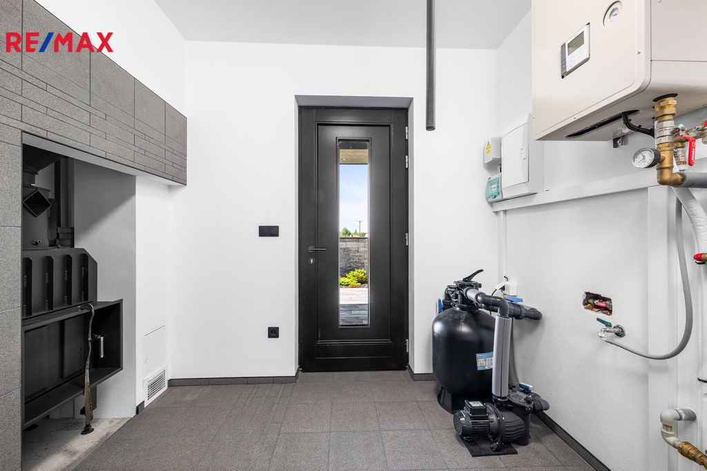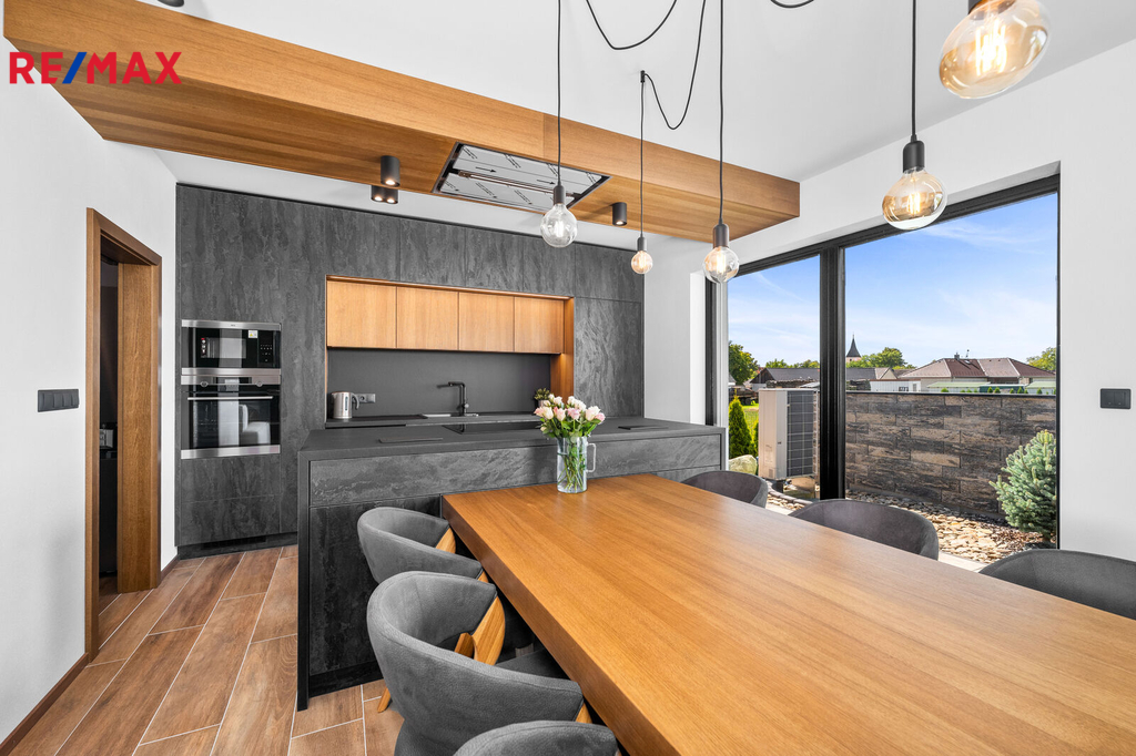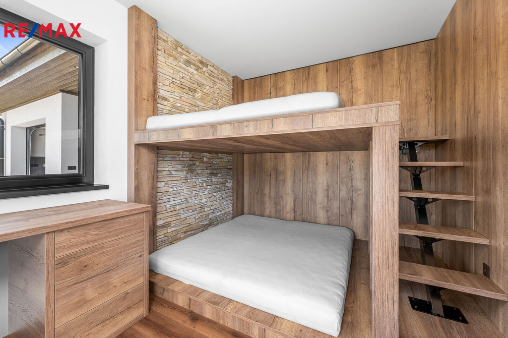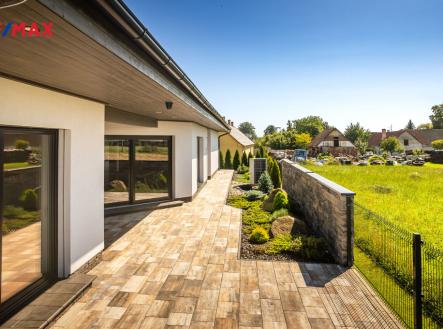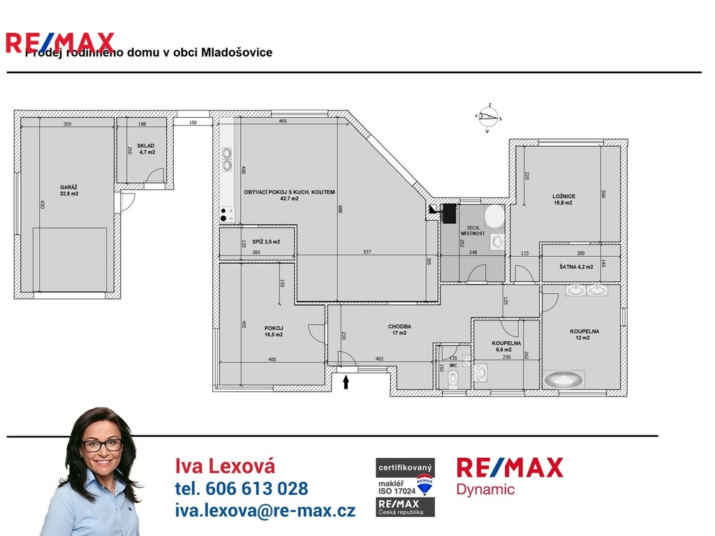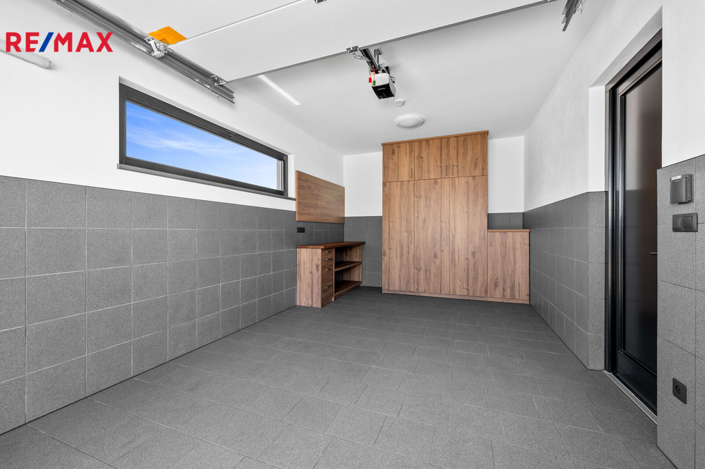 Nabízíme k prodeji nadstandardně provedenou, zatím neobývanou novostavbu přízemního rodinného domu v obci Mladošovice, vzdálené 9 km od Třeboně a 6,5 km z Borovan. Součástí pozemku o celkové výměře 912 m2 je samostatný, nepodsklepený rodinný dům typu bungalov se samostatnou garáží se skladem o celkové zastavěné ploše 192 m2. Prostor mezi garáží a domem je zastřešen a vznikl zde tak prostor pro parkování dalšího vozu. Součástí nemovitosti je také zastřešená pergola umístěná v zadní části zahrady a krytý venkovní bazén navazující na vydlážděnou terasu obklopující celý dům. Obytná část je dispozičně řešena jako 3+kk o podlahové ploše 128,4 m2 a sestává se z chodby, prostorného obývacího pokoje s krbovými kamny, kuchyňským koutem a spíží, pokoje, ložnice se šatnou, koupelny s vanou a sprchovým koutem, samostatného WC, druhé koupelny se sprchovým koutem, s WC a prostorem na pračku se sušičkou. Součástí je také technická místnost, z níž je vstup stahovacím schodištěm do podkroví, kde je ve středové části půdy připraven prostor pro uskladnění věcí, popř. by zde bylo možné zřídit jeden další pokoj. Dispoziční řešení domu s rozměry jednotlivých místností části najdete na přiloženém půdorysu. Nemovitost se prodává včetně nadstandardního, velice kvalitního vybavení: kuchyňská linka se spotřebiči, na míru zhotovený dřevěný nábytek (vestavné šatní skříně v chodbě, úložný systém ve spíži a šatně, koupelnový nábytek, předsíňová stěna, patrová postel vč. stolu a skříně v pokoji, skříně v garáži aj.). V domě zůstane i další vybavení, které je vidět na fotografiích včetně osvětlení. Na oknech v obývacím pokoji a ložnici jsou předokenní žaluzie, podlahové krytiny tvoří lepený vinyl a dlažba, dům má zabezpečovací systém. Postaven je z cihelných bloků Porotherm 44 cm, vybaven kvalitními dřevěnými dveřmi i okny (trojsklo). Vytápění je řešené ústředními, podlahovými rozvody, zdrojem je tepelné čerpadlo vzduch-voda. V obývacím pokoji jsou krbová kamna, která jsou obsluhována z technické místnosti. Ohřev vody zajišťuje 300 l kombinovaný bojler (tepelné čerpadlo a elektřina). Objekt je napojený na obecní přípojku vodovodního řadu, kanalizace je řešena vlastní čistírnou odpadních vod s přepadem do kanalizace. Dešťová voda je svedena do dvou retenčních nádrží, ze kterých je následně řešena závlaha zahrady. Pozemek je kompletně oplocen, přístup je po zpevněné cestě a vjezd bránou na el. pohon. Zahrada je osázená okrasnými dřevinami a součástí je zastřešený bazén (6 x 3,8 x 1,4 m). Tento rodinný dům nebyl primárně stavěn na prodej, byl kladen důraz na kvalitní provedení i vybavení, což je jeho hlavní předností. Další výhodou je umístění na úplném okraji zástavby s výhledem do otevřené krajiny. V obci je obchod, mateřská škola, pohostinství. Komplexní občanská vybavenost je pak v Borovanech nebo v Třeboni. Mladošovice jsou dostupné pravidelným autobusovým spojem (Č. Budějovice – Borovany – Třeboň) .