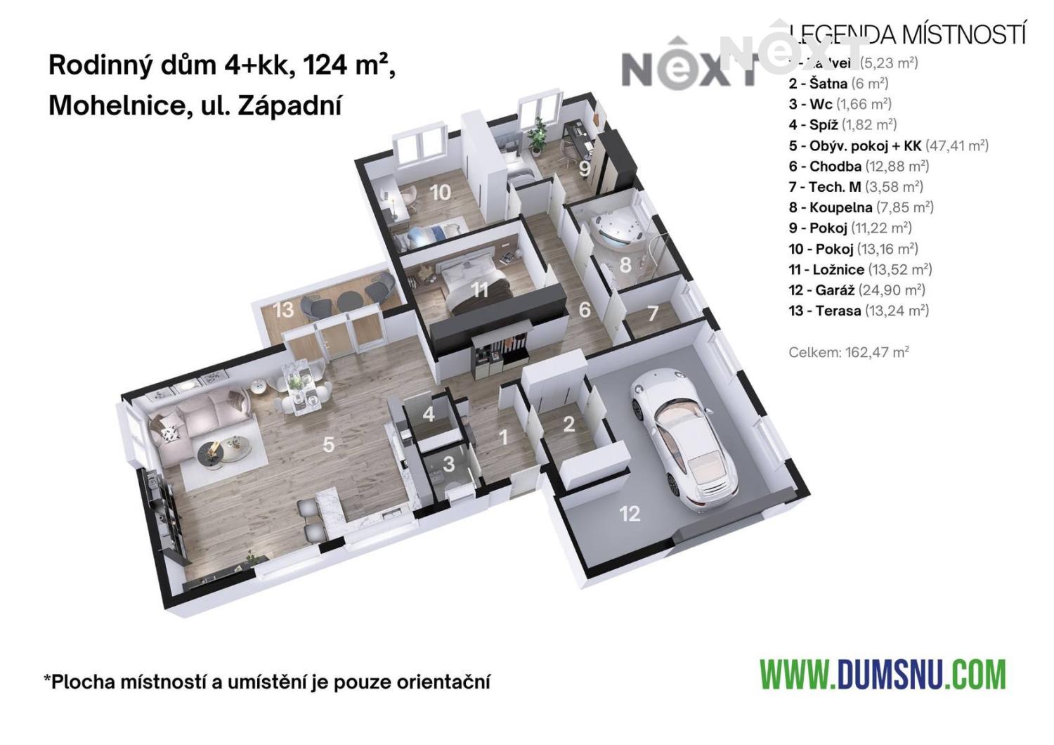 Nabízíme vám moderní rodinný dům s plochou 124 m² a zahradou o rozloze 615 m², nacházející se Mohelnici. Jedná se o samostatně stojící přízemní dům kolaudovaný v roce 2018, postavený ve zděném provedení, který zaujme kvalitním zpracováním, praktickou dispozicí a pečlivě udržovanou zahradou. Dům nabízí dispoziční řešení 4+kk s prostorným obývacím pokojem, který díky netradičně vysokým stropům (3,2 m) působí mimořádně vzdušně a velkoryse. Na něj navazuje moderní kuchyně s jídelní částí, odkud je přímý vstup na terasu o velikosti 26 m² a zahradu s jihozápadní orientací. Kuchyňská linka je vyrobena na míru, vybavena vestavěnými spotřebiči a navržena tak, aby poskytovala maximum pracovního i úložného prostoru. Součástí domu je místnost pro šatnu, samostatná toaleta pro hosty, technická místnost s pračkou, sušičkou a bojlerem. Koupelna s vanou i sprchovým koutem a další toaletou, tři neprůchozí pokoje a garáž o ploše 25 m² s automatickými vraty. Vytápění je řešeno elektrokotlem s podlahovým vytápěním v celém domě, ohřev vody zajišťuje zásobník. Okna jsou plastová s trojskly,,dům je napojen na městský vodovod a kanalizaci. Energetická náročnost budovy je ve třídě C - úsporná, což znamená rozumné provozní náklady při zachování komfortu a příjemného klimatu v interiéru. Pozemek o celkové výměře 833 m² je rovinatý, oplocený a působí velmi upraveným dojmem. Pečlivě udržovaná zahrada s okrasnými dřevinami, keři a vzrostlým trávníkem vytváří příjemné soukromí a klidné prostředí pro odpočinek. Je zde dostatek prostoru pro bazén, pergolu či dětské hřiště. Před domem je další parkovací místo na vlastním pozemku. Lokalita nabízí ideální spojení klidu a dostupnosti – ulice Západní je slepá, tvořena výhradně rodinnými domy, s minimálním provozem a vynikající dostupností do centra města i na dálnici D35 směr Olomouc, na Šumperk a Prahu. Mohelnice disponuje kompletní občanskou vybaveností – 2 mateřské, 3 základní a 2 střední školy, obchody (Lidl, Penny, Kaufland), restaurace, sportoviště, kulturní dům i zdravotní služby a oblíbený krytý bazén. Tento dům představuje ideální volbu pro ty, kteří hledají moderní, úsporné a pohodlné rodinné bydlení v klidné části Mohelnice s rychlým spojením do větších měst. Pokud vás tento dům zaujal, neváhejte mi zavolat , rád vás domem provedu a poskytnu další informace. Součástí nabídky je bezplatná konzultace s naším finančním poradcem, který vám zajistí na míru to nejlepší financování. Pro komunikaci uvádějte evidenční číslo zakázky Pro komunikaci uvádějte evidenční číslo zakázky N115907.