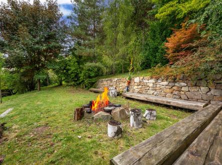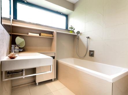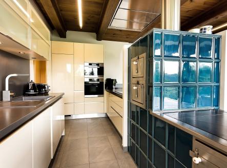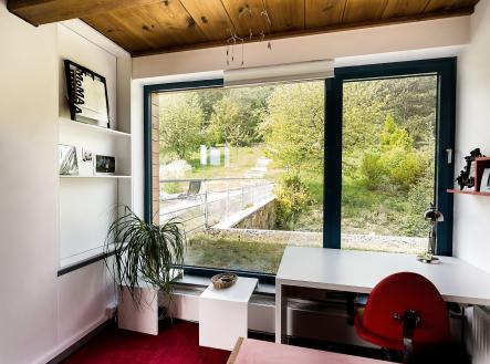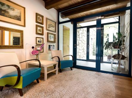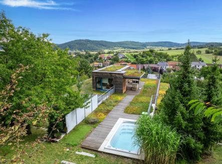 Luxusní vila z dílny významného brněnského architekta Jaroslava Černého je situována na jižním svahu pod lesem na okraji obce Moravské Knínice. Díky své výjimečné poloze splňuje dům veškerá kritéria pohodlného rodinného bydlení (6+kk) a zároveň poskytuje velmi dobrou dopravní dostupnost do centra Brna i na dálnice (8 km od hranice města). Lokalita v bezprostředním dosahu přírody je ideální pro trávení volného času, cyklistiku, pěší turistiku apod. (Brněnská přehrada, přírodní parky Údolí Bílého potoka a Podkomorské lesy a další). Svým citlivým umístěním a orientaci (V, J, Z) poskytuje dům nadstandardní výhledy do okolní přírody, mimo jiné i na golfový resort Kaskáda v Jinačovicích. Moderní funkcionalistická stavba je umístěna v nejvyšším bodě v okolí a nachází se v klidné slepé ulici. Parkování zajišťuje prostorná dvougaráž a další parkovací místa před domem. Vysoce ekologickým prvkem jsou zelené střechy na celé budově, které pozitivně ovlivňují vnitřní klima objektu, zajišťují citelnou úsporu energií a retenci dešťové vody. K domu náleží pozemek o celkové velikosti 2 703 m² s upravenou okrasnou zahradou se vzrostlými dřevinami. Celý pozemek je oplocený s možností přímého vstupu brankou do lesa. Velikost pozemku, jeho umístění a vzrostlá vegetace po celém jeho obvodu poskytují majiteli domu absolutní soukromí na zahradě, všech terasách i u bazénu. Pozemek je tvořen dvěma stavebnímu parcelami, na jedné z nich stojí dům, druhá slouží jako zahrada, ale v případě potřeby je zde možno postavit další rodinný dům. Panoramatické výhledy, vysoká míra soukromí, nadčasový design, dokonalá harmonie s přírodou - to jsou hlavní atributy výjimečnosti tohoto luxusního domu. Ve vnitřních prostorech se projevuje architektonický styl Atelieru A3 Ing. arch. Jaroslava Černého. Při řešení vnitřních dispozic byl kladen důraz na jednoduchost, praktičnost a nadčasovost, zároveň nemovitost disponuje velkým množstvím úložných prostor. Nadstandardní výška stropů 2,85 m podporuje neobvyklou vzdušnost všech interiérů. Ve vstupním podlaží se nachází garáž pro 2 auta, zádveří, vstupní hala s vestavěnými skříněmi na šaty a samostatná šatna s vestavěnými skříněmi. Druhé nadzemní podlaží tvoří centrální hala se schodištěm, dva prostorné pokoje s výstupem do zahrady, koupelna s WC a technická místnost s tepelným čerpadlem. Třetí nadzemní podlaží vyplňuje vzdušný a prosluněný obytný prostor, který tvoří prakticky řešená kuchyně s jídelní částí a obývací pokoj s výstupem na venkovní terasu s výhledem do širokého okolí. Dalšími místnostmi v tomto patře jsou dětský pokoj a ložnice s přímým vstupem do koupelny a sauny s ochlazovacím bazénkem, hala a samostatné WC. Důležitou součástí tohoto podlaží je šatna, velké množství úložných prostor, zázemím pro kuchyni a skladem pro provozní věci. Z toho podlaží lze přímo vstoupit také na prostorný zadní dvůr funkčně propojený se zahradou. Nejvyšší podlaží tvoří atypická prosvětlená pracovna orientovaná do zeleně se vstupem na venkovní terasu s výhledy do širokého okolí. Moderní architektonické řešení v duchu funkcionalismu a vhodná vnitřní dispozice splňují nejnáročnější požadavky a nejvyšší standard bydlení v jedné z nejzajímavějších lokalit v okolí města Brna. Dispozice: 1.PP zádveří 4,80 m², šatna 4,50 m², hala 10,38 m², dvougaráž 45,02 m², schodiště 7,72 m² (celkem 1.PP = 72,42 m²) 1.NP schodišťová hala 18,24 m², pokoj 23,48 m², pokoj 25,86 m², koupelna 7,06 m², kotelna 6,94 m² (celkem 1.NP = 81,58 m²) 2.NP hala 14,95 m², obývací pokoj 39,50 m², kuchyně 12,70 m², pokoj 15,37 m², ložnice 23,94 m², koupelna 5,60 m², WC 2,14 m², sauna se zázemím (sprcha, ochlazovací bazének) 17,04 m², hala 5,76 m², komora 8,42 m², spíž 5,24 m², sklad 11,52 m², technická místnost 7,12 m² (celkem 2.NP 169,30 m² + terasy + dvůr 29,43 m²) 3.NP schodišťová hala 13,50 m², pracovna 12,50 m² (celkem 3.NP 26 m² + terasa a zelená střecha 202 m²) Vybavení: tepelné čerpadlo Siemens vzduch/vzduch, podlahové topení, doplňující radiátory pro koupelny, podlahy dlažba a dřevo-masiv, obložkové zárubně a vnitřní dveře 210 cm výška, sanita Grohe, centrální vysavač, hliníková okna Schüco, kuchyňská linka Schmidt, spotřebiče Miele, kachlová kamna, potravinový výtah, bazén USSPA s vyhříváním, protiproudem a vířivou koupelí, zabezpečovací systém Další: terasy funkčně spojené s obytným prostorem (možnost posezení, grilování, odpočinku), relaxační zóny a zákoutí na zahradě, samostatná rekreační chata na hranici lesa, ovocné stromy, okrasné dřeviny Lokalita: veškerá občanská vybavenost - MŠ, ZŠ, obecní knihovna, další v 1 km vzdáleném městě Kuřim (obchody, služby, lékaři, pošta, sportoviště, aquapark) nebo přímo v Brně po 10 min. jízdy (Globus, Bauhaus) Energetická třída B - velmi úsporná