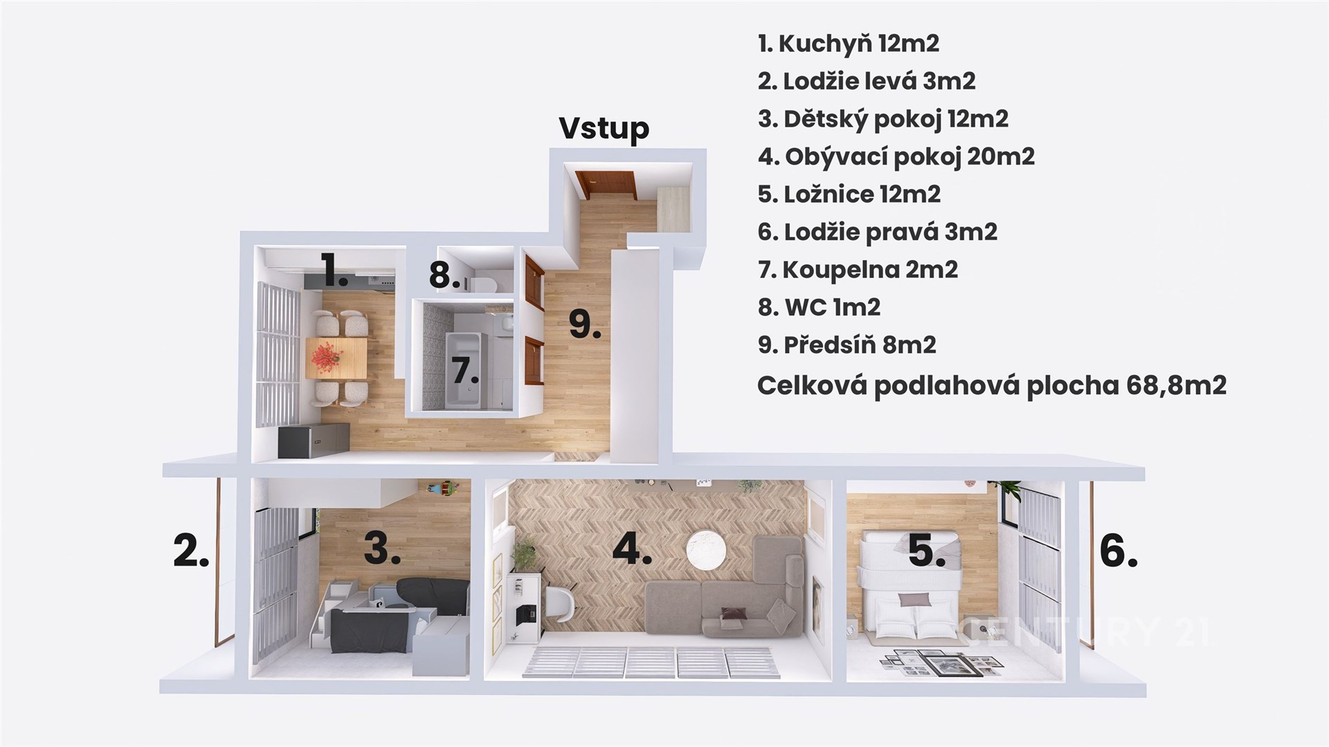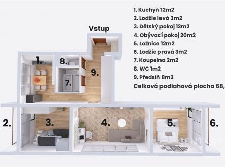 Hledáte prostorné rodinné bydlení, které je zrekonstruované a připravené k nastěhování v horizontu několika týdnů? Tento byt v družstevním vlastnictví nabízí ideální kombinaci klidu, moderního designu a bohatého vybavení v ceně. Majitelé se stěhují do nového, takže byt bude volný k předání dle dohody. Dispozice a interiér (68,8 m²): Dispozice bytu je velmi praktická a nabízí dostatek soukromí pro všechny členy rodiny. Obývací pokoj (20 m²): Světlý obývací pokoj s kvalitní podlahou v dekoru dřeva nabízí dostatek prostoru pro relaxaci i rodinná setkání. Součástí prodeje je nová sedací souprava a konferenční stolek (pořízeno 09/2025). Kuchyně (12 m²): Moderní linka s vestavěnými spotřebiči Mora (trouba, mikrovlnka, myčka) a plynovou varnou deskou (revize 01/2026). Ložnice (12 m²) a dětský pokoj (12 m²): Oba pokoje mají vlastní vstup na samostatnou lodžii (každá 3 m²), což je unikátní bonus. Úložné prostory: V předsíni (8 m²) a pokojích se nachází celkem 3 prostorné vestavěné skříně. Koupelna a WC: Zděné jádro v moderním obkladu, v koupelně vana a nová pračka (pořízena 05/2025). Nadstandardní doplňky v ceně: V bytě zůstává většina vybavení (sedačka, pračka, TV, nábytek v dětském pokoji, komody v ložnici). Okna jsou osazena stíněním „den a noc“ a v obývacím pokoji elegantními japonskými žaluziemi. Občanská vybavenost: V těsné blízkosti se nachází Mateřská škola U Cáchovny, Základní škola, hospic a Nemocnice Most. Příroda a sport: Jen pár minut chůze Vás dělí od oblíbené rekreační oblasti Ressl, který nabízí koupaliště, cyklostezky a ideální trasy pro procházky. Přímo u domu je navíc dětské hřiště. Dům se nachází v jedné z nejvyhledávanějších a nejklidnějších částí Mostu. Stav domu: Nová sedlová střecha (2021). V blízké budoucnosti je naplánována kompletní výměna oken a následné zateplení, což zvýší hodnotu nemovitosti a sníží náklady na energie. Informace a financování: Vlastnictví: Družstevní. Měsíční náklady: Celkové náklady ve výši 8 241 Kč měsíčně (vypočteno pro 4 osoby). Financování: Hypotéka je možná v případě ručení jinou nemovitostí, nebo lze využít úvěr ze stavebního spoření. Rezervujte si čas své prohlídky a přijďte se podívat na své nové bydlení osobně.