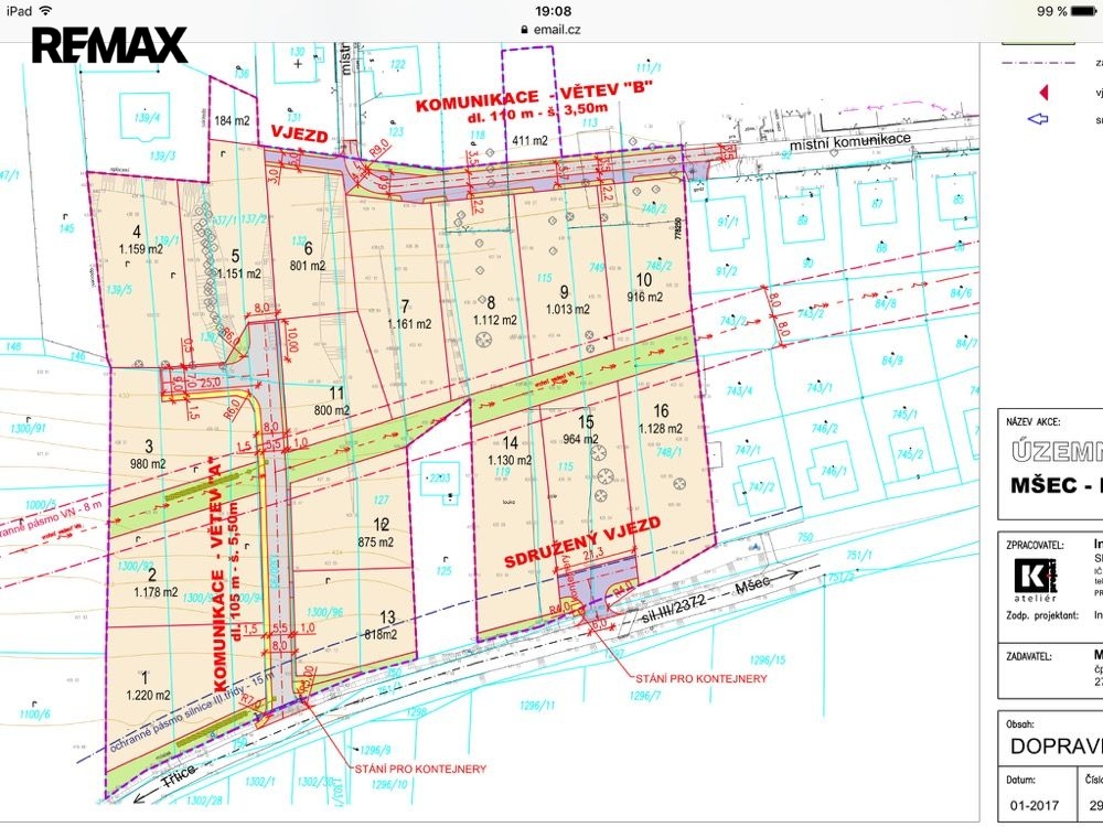 Stavební pozemek o výměře 822 m2 se nachází v připravované lokalitě 11 parcel na jihozápadním okraji městysu Mšec, cca 5 km od dálnice D6. Dle územní studie jsou určeny k výstavbě samostatně stojících rodinných domů (každý až o třech bytových jednotkách). Tato svažitá parcela je v přiložené územní studii pod číslem 11, zde uvedená výměra 800 m2 byla původní. Cena je 2.600 Kč za 822 stavebních m2 + 1.000 Kč za 109 obslužných m2, celkem 2,246.200 Kč. Postupně probíhá příprava zasíťování pozemků, aktuálně je dokončen projekt na inženýrské sítě a každým dnem by mělo být vydáno stavební povolení na jejich výstavbu. Kanalizace, voda a elektřina povedou od jižní silnice Mšec - Třtice a je potřeba je společně s vlastníky ostatních "jižních" pozemků (1, 2, 3, 4, 12 a 13) postupně dobudovat a zaplatit. Výhodou je, že budete jako vlastník jednoho ze sedmi pozemků platit vždy jen právě jednu sedminu všech nákladů. Ideální varianta pro toho, kdo se stavbou nespěchá a bude za svoji trpělivost a snahu odměněn ušetřením spousty peněz, neboť po plném zasíťování pozemku bude cena o cca 1.500 Kč/m2 vyšší. Mšec je městys s cca 900 obyvateli a dobrým spojení do Prahy (5 km nájezd na dálnici D6, 35 minut autem), do Rakovníka (20 km) a Kladna (15 km). Základní vybavenost je přímo v místě: školka, škola, zdravotnické zařízení, pošta, obchody, navíc lesy, rybníky, cyklostezky atd. Koupi pozemku můžete financovat hypotečním úvěrem, který rádi vyřídíme. Pro další informace kdykoli volejte nebo pište, vše vysvětlím a dokumentaci pošlu. Prodávající si vyhrazuje právo vybrat kupujícího na základě jím zvolených kritérií.