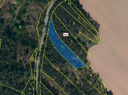 Lesní pozemek o výměře 1796 m2, parcelní číslo 526, podíl 1/1, katastrální území Jedov, obec Náměšť nad Oslavou, obec s rozšířenou působností Náměšť nad Oslavou, okres Třebíč, Kraj Vysočina. Částečně po těžbě.