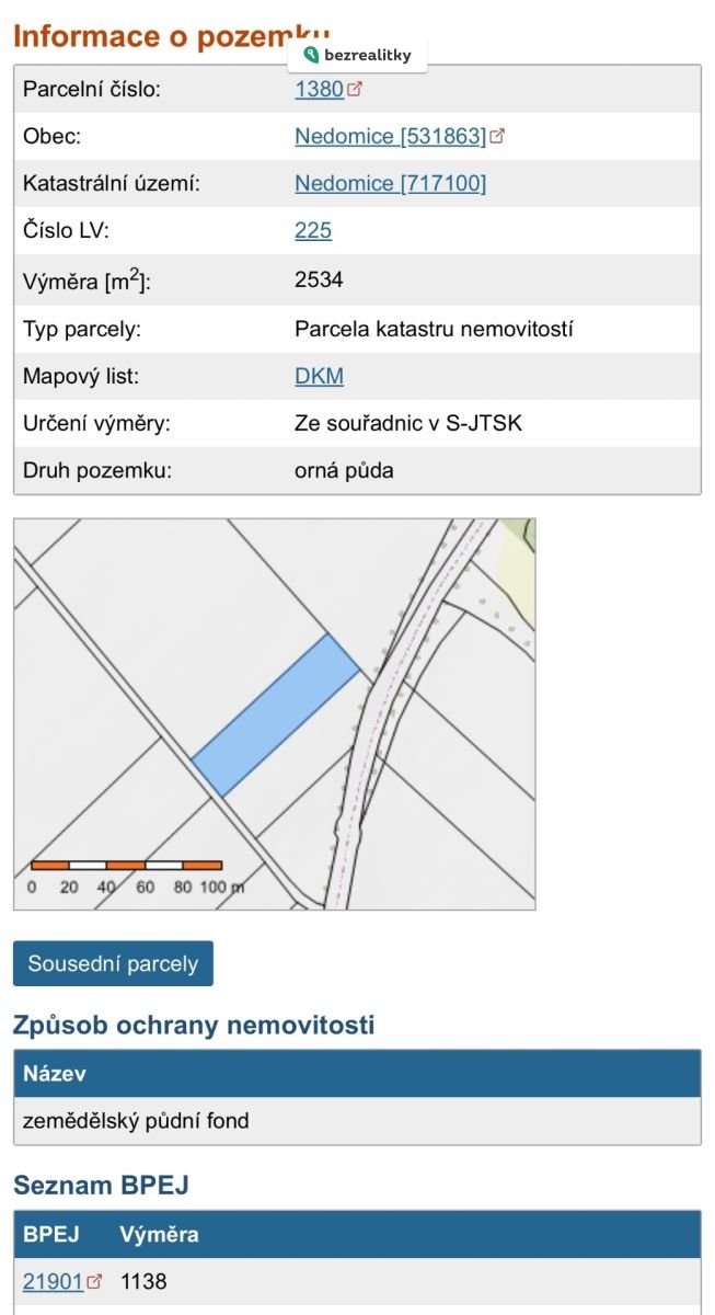 Nabízím k prodeji pozemek o rozloze 2534 m², který se nachází v klidné a příznivé lokalitě v Nedomicích, parc. č. 1380. Jedná se o pole, cca 600 m od hranice území určeného k zástavbě, ideální volbu pro ty, kteří hledají investiční příležitost nebo prostor pro realizaci vlastních projektů. Šířka pozemku cca 26m a délka 98m. Pozemek přístupný z pozemku parc.č. 1507 (ostatní komunikace) a pozemku parc.č. 1512 (ostatní komunikace), oba ve vlastnictví obce Nedomice. V případě zájmu o podrobnější informace je možné mě kontaktovat skrze zprávy prostřednictvím komunikační platformy. Tato nemovitost je určena výhradně přímým zájemcům o koupi. Na inzerát můžete také reagovat přímo na webu Bezrealitky.