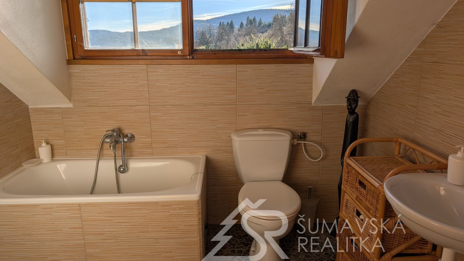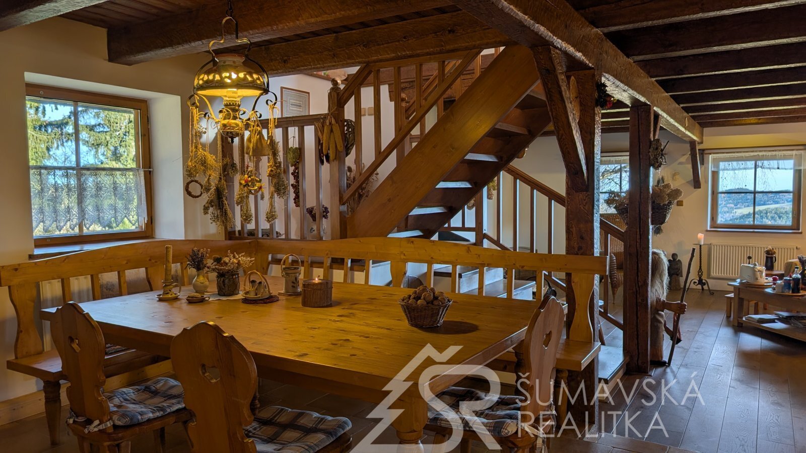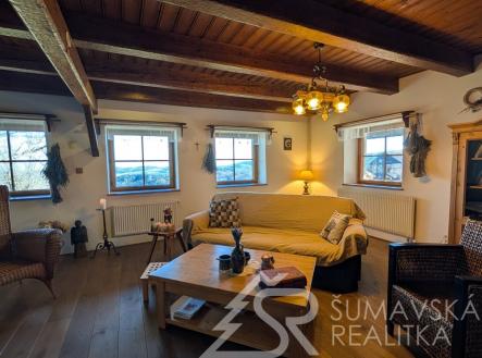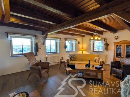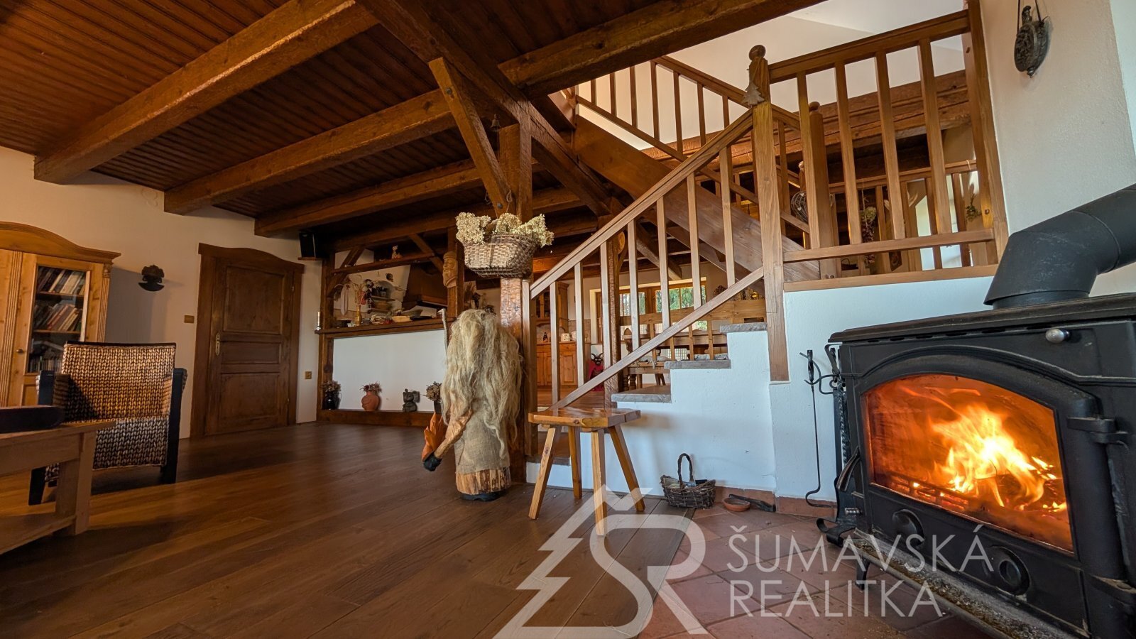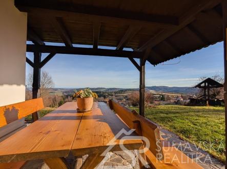 DŮM NA SMOTĚ U LESA S FANTASTICKÝM PANORAMATICKÝM VÝHLEDEM, OSTRUŽNO NA ŠUMAVĚ. Často jezdím na kole po Šumavě a nedávno jsem zabloudil do lokality pod hradem Kašperk, kde jsem narazil na samotu pod lesem s naprosto nádherným výhledem. V úžasu jsem si doslova sedl na zadek a kochal se dalekými výhledy až na Brdy. „Tak to je luxusní místo!“ říkal jsem si tehdy a náhoda tomu chtěla, že se pak v naší kanceláři objevil sám pan majitel a dal nám tento šperk mezi nemovitostmi prodat. Pozemek: o celkové velikosti 1.924 m2 Lokalita: Ostružno na Šumavě se nachází ve výšce kolem 740 m n.m., asi 8 km od města Sušice a necelých 6 km od Kašperských Hor. Hrad Kašperk je od nabízeného domu vzdálen pouze 3 km! Od domu se nabízejí kouzelné výhledy do vnitrozemí, například na hrad Rabí, nebo na kostel v Žihobcích. Opačným směrem se zdvíhají tisícimetrové vrcholy Šumavy: Žďánov (1.064 m.n.m.) a Javorník (1.066 m.n.m.). Pohledově je však s Ostružnem nejvíce spjata oblá špic hory Sedlo s bývalým keltským hradištěm a nyní i s rozhlednou. Osada Ostružno spadá pod obecní úřad Nezdice na Šumavě, ty se v současné době stávají rekreační oblastí. Je zde koupaliště, lyžařský vlek s vlastní rolbou, restaurace, obchod, obecní vývařovna, muzeum řemeslné výroby i zázračná studánka. Výhodou je i Obecní úřad, pošta a přímé autobusové spojení do Prahy. Popis domu: samostatně stojící dům, jednopodlažní, nepodsklepený s obytným podkrovím. Střecha sedlová krytá betonovou taškou Bramac. Velice příjemná je krytá jihovýchodní terasa s dechberoucím výhledem. V přízemí se ze zádveří vstupuje do spodní koupelny, samostatného WC a samozřejmě do obývajícího pokoje spojeného s kuchyní a jídelnou (71 m2). Po dřevěném schodišti vystoupáme do patra, kde se nachází tři samostatné ložnice, druhá koupelna, šatna a krytý balkon. Technická místnost s kotlem, bojlerem a pračkou je v přízemí. Vedle domu je ještě samostatná kolna/dílna. Okna jsou dřevěná, krytá okenicemi. Inženýrské sítě: Zdroj vody je umístěn přímo pozemku a jedná se o vrtanou studnu o hloubce 50 m, odkanalizování je přes malou domovní čistírnu. Elektřina 230/400 V. Zdroj tepla je elektrokotel Protherm a krbová kamna s výměníkem. Bezproblémový příjezd k nemovitosti je zajištěn po komunikacích a to právní i fyzický.