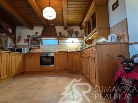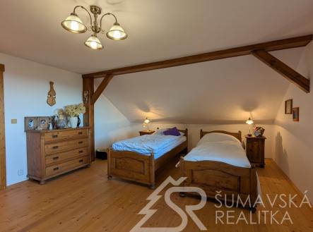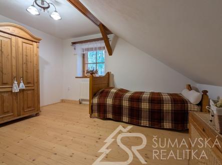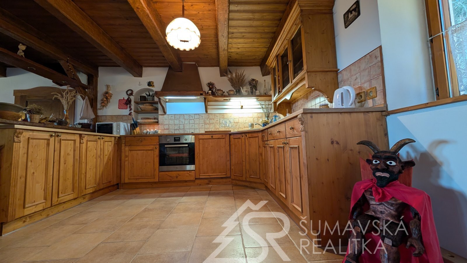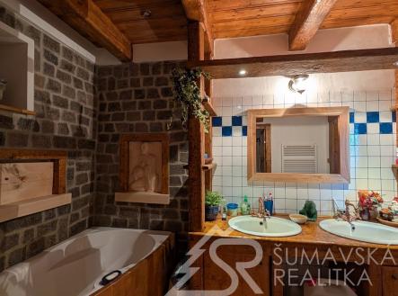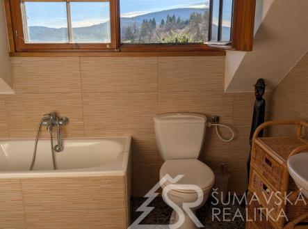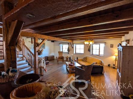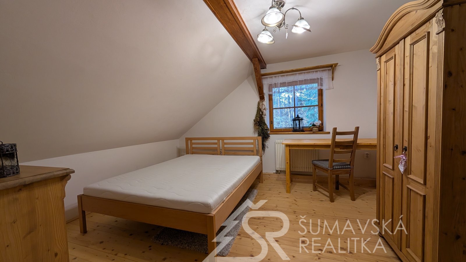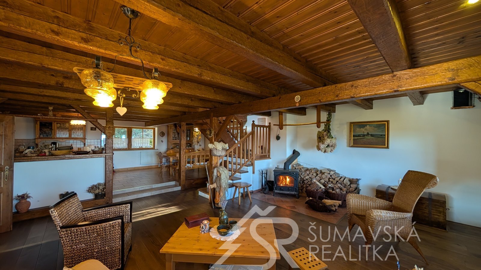 DŮM NA SMOTĚ U LESA S FANTASTICKÝM PANORAMATICKÝM VÝHLEDEM, OSTRUŽNO NA ŠUMAVĚ. Často jezdím na kole po Šumavě a nedávno jsem zabloudil do lokality pod hradem Kašperk, kde jsem narazil na samotu pod lesem s naprosto nádherným výhledem. V úžasu jsem si doslova sedl na zadek a kochal se dalekými výhledy až na Brdy. „Tak to je luxusní místo!“ říkal jsem si tehdy a náhoda tomu chtěla, že se pak v naší kanceláři objevil sám pan majitel a dal nám tento šperk mezi nemovitostmi prodat. Pozemek: o celkové velikosti 1.924 m2 Lokalita: Ostružno na Šumavě se nachází ve výšce kolem 740 m n.m., asi 8 km od města Sušice a necelých 6 km od Kašperských Hor. Hrad Kašperk je od nabízeného domu vzdálen pouze 3 km! Od domu se nabízejí kouzelné výhledy do vnitrozemí, například na hrad Rabí, nebo na kostel v Žihobcích. Opačným směrem se zdvíhají tisícimetrové vrcholy Šumavy: Žďánov (1.064 m.n.m.) a Javorník (1.066 m.n.m.). Pohledově je však s Ostružnem nejvíce spjata oblá špic hory Sedlo s bývalým keltským hradištěm a nyní i s rozhlednou. Osada Ostružno spadá pod obecní úřad Nezdice na Šumavě, ty se v současné době stávají rekreační oblastí. Je zde koupaliště, lyžařský vlek s vlastní rolbou, restaurace, obchod, obecní vývařovna, muzeum řemeslné výroby i zázračná studánka. Výhodou je i Obecní úřad, pošta a přímé autobusové spojení do Prahy. Popis domu: samostatně stojící dům, jednopodlažní, nepodsklepený s obytným podkrovím. Střecha sedlová krytá betonovou taškou Bramac. Velice příjemná je krytá jihovýchodní terasa s dechberoucím výhledem. V přízemí se ze zádveří vstupuje do spodní koupelny, samostatného WC a samozřejmě do obývajícího pokoje spojeného s kuchyní a jídelnou (71 m2). Po dřevěném schodišti vystoupáme do patra, kde se nachází tři samostatné ložnice, druhá koupelna, šatna a krytý balkon. Technická místnost s kotlem, bojlerem a pračkou je v přízemí. Vedle domu je ještě samostatná kolna/dílna. Okna jsou dřevěná, krytá okenicemi. Inženýrské sítě: Zdroj vody je umístěn přímo pozemku a jedná se o vrtanou studnu o hloubce 50 m, odkanalizování je přes malou domovní čistírnu. Elektřina 230/400 V. Zdroj tepla je elektrokotel Protherm a krbová kamna s výměníkem. Bezproblémový příjezd k nemovitosti je zajištěn po komunikacích a to právní i fyzický.