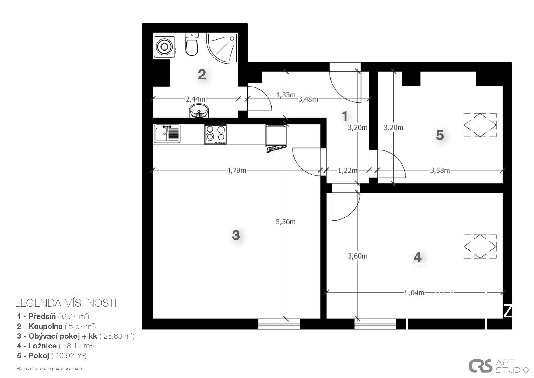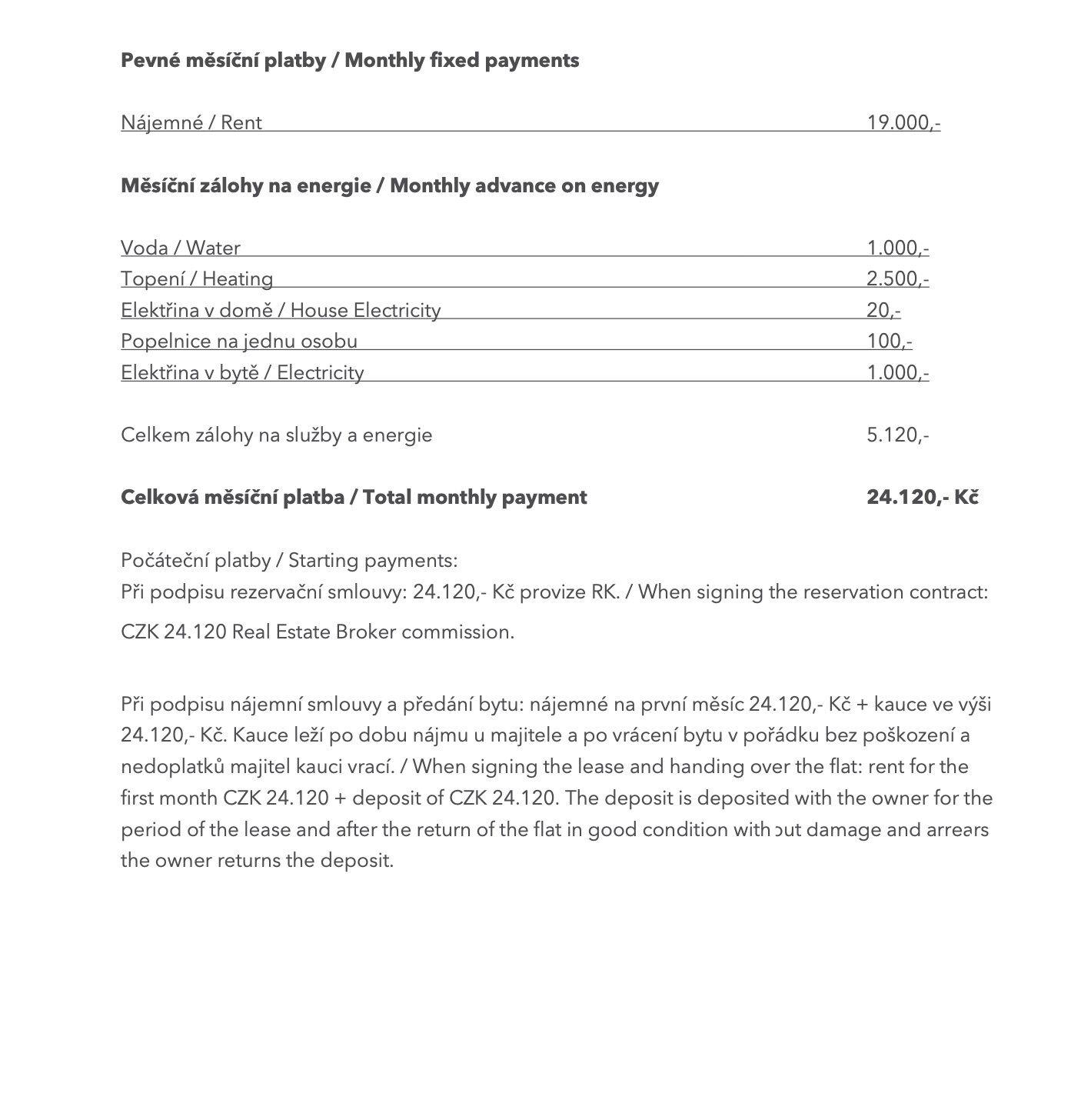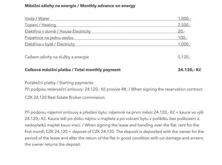 Nabízíme vám v dlouhodobému pronájmu byt s dispozicí 3+kk a výměrou 70 m2 v obci Nová Ves (Praha-východ). Byt se nachází v prvním patře a je úplně nový. V bytě ještě nikdo nebydlel a budete jeho první nájemníci. Tento byt obsahuje velký obývací pokoj s kuchyňským koutem, dvě ložnice, koupelnu s wc. Jedná se o moderní byt. K bytu patří jedno parkovací místo před domem. Nájemné je 19.000,- Kč / měsíčně + zálohy na 5.120,- zálohy na energie a služby (z toho je 1000,-/měs. voda, 2500,- topení, 20,-/měs. elektřina v domě, 100,-/měs. na osobu za odvoz odpadků, 1000,- /měs. elektřina v bytě). V bytě je topení vyřešeno radiátory s centrálním vytápěním a ohřev teplé vody elektrickým bojlerem. V bytě kompletně vybavená kuchyňská linka a koupelna, tak jak je vyobrazeno na fotografiích. Jinak je byt prázdný. Při nastěhování se platí 24.120,- nájemné na první měsíc + 24.120,- kauce + 24.120,- provize.