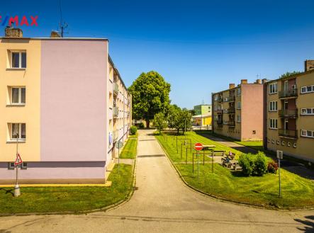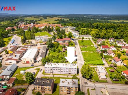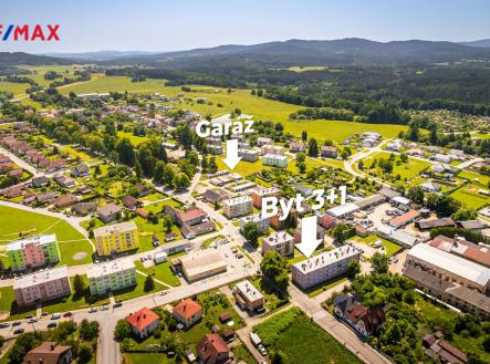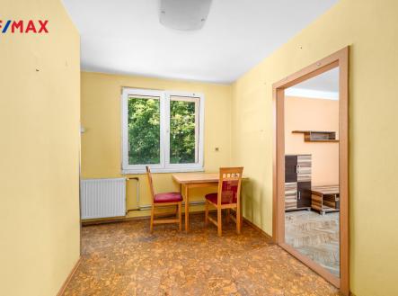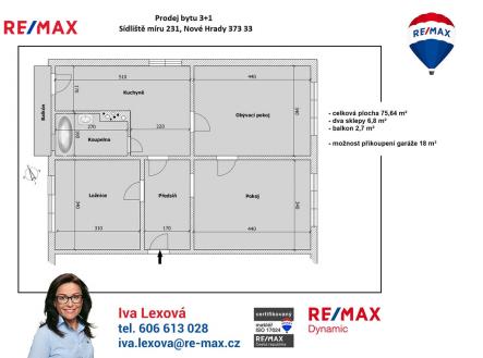 Nabízíme ke koupi zděný byt v osobním vlastnictví umístěný v ul. Sídliště míru v Nových Hradech. Byt s dispozicí 3+1 s celkovou plochou 75,64 m² (dva sklepy 6,8 m² a balkon 2,7 m²) se nachází ve 2. patře staršího, zděného domu bez výtahu. Sestává se z předsíně, ložnice, koupelny s vanou a WC, kuchyně s balkonem a jídelnou a dvou pokojů. Orientovaný je na sever (kuchyně a ložnice) a jih (pokoje). Dispoziční řešení s orientační plochou jednotlivých místností najdete na přiloženém půdorysu. Byt je v původním stavu, vyklizen a připraven k rekonstrukci dle představ nových majitelů. Dům byl před několika lety zateplen a byla vyměněná plastová okna. Vytápění je řešené vlastním elektrickým kotlem umístěném ve sklepě (se spínačem v bytě) s rozvody do radiátorů a ohřev vody je el. bojlerem v koupelně. K bytu je možné přikoupit zděnou, suchou garáž, vzdálenou asi 200m od domu, o velikosti 18 m². Měsíční náklady na provoz bytu činí cca 2.200 Kč (z toho fond oprav 1.664 Kč) + spotřeba elektřiny. Komplexní občanská vybavenost je přímo v Nových Hradech nebo v 15km vzdálených Trhových Svinech. Předností nemovitosti je umístění v lokalitě obklopené malebnou přírodou Novohradských hor, protkanou sítí cyklostezek a turistických tras. Pro osoby pracující v Rakousku může být výhodou hraniční přechod. V případě zájmu o bližší informace nebo prohlídku uvedeného bytu kontaktujte makléře nabídky.