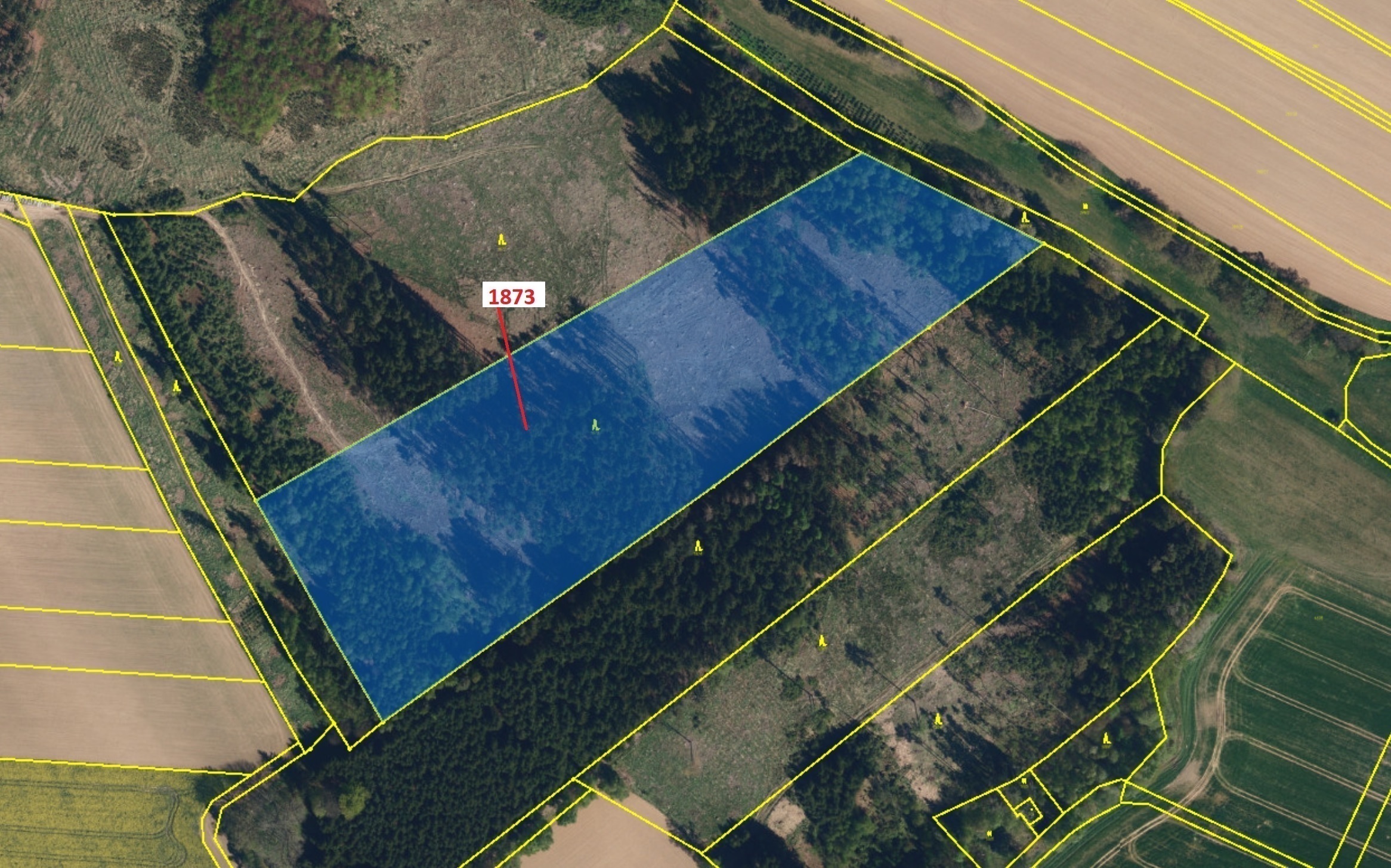 Lesní pozemek o výměře 32 740 m2, parcelní číslo 1873, podíl 1/1, katastrální území Obrataň, obec Obrataň, obec s rozšířenou působností Pacov, okres Pelhřimov, Kraj Vysočina. Po těžbě.