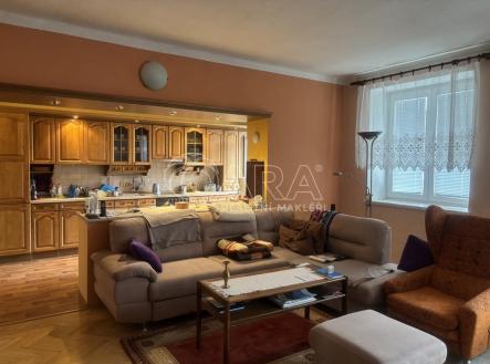 Byt 3+1, 100,7m2, malý balkón, úložný prostor na půdě 15m2, sklep. V prosinci zasílejte poptávky emailem, z důvodu pobytu v zahraničí. Nabízíme k prodeji prostorný byt v osobním vlastnictví s dispozicí 3+1 ve velmi příjemné lokalitě v bytovém domě umístěném v zahradě. Byt se nachází v 1. patře dvoupodlažního cihlového domu. Celkem je v domě 10 bytů. Kuchyně a obývací pokoj je propojen a celkový prostor je 39m2, z kuchyně se francouzskými dveřmi dostanete na malý balkónek s výhledem do stráně k lesu. Kuchyňská linka je vybavena vestavěnou lednicí s mrazákem, špajzem a el.sporákem. V obýváku na podlaze jsou dřevěné parkety. Vstupní předsíní 16,6m2 se dostanete centrálně do všech místností, kuchyně, obýváku, samostatné toalety, koupelny a pokoje s navazujícím vstupem do ložnice. Koupelna, je svými rozměry 7,2m2 komfortně prostorná, je vybavena vanou se sprchovou zástěnou, umyvadlem, pračkou. V koupelně by mohl být vybudován i sprchový kout k plnému komfortu. Pokoj 24m2 s výhledem do zahrady je vybaven dřevěnými parketami, další pokoj - ložnice, 12,8m2 je vybavena šatní skříní. V pokojích jsou na podlahách dřevěné parkety. K bytu náleží nadstandardně velký úložný prostor na půdě cca 15m2 a je vybaven skříněmi a sklep. Byt se nachází v cihlovém bytovém domě v zahradě, blízko centra obce, v klidném prostředí, ideálním pro procházky do přírody s krásnými výhledy. Přitom do centra, kde najdete obchody i autobusovou zastávku, je to pěšky jen 5 minut. Byt je v udržovaném stavu, s novější dřevěnou kuchyňskou linkou v rustikálním designu. V roce 2000 došlo k výměně oken za plastová dvojskla. Vytápění zajišťují moderní akumulační kamna přímo v bytě, teplou vodu pak ohřívá vlastní elektrický bojler. Bytový dům je dobře udržován a je v dobrém stavu. Byt je v osobním vlastnictví a je k dispozici ihned. Zařízení a nábytek v bytě může být ponechán dle dohody. Tato nemovitost představuje zajímavou příležitost, neboť se momentálně jedná o jedinou nabídku tohoto typu v blízkém okolí. V případě zájmu o prohlídku mě kontaktujte ideálně na email, v prosinci jsem v zahraničí, tak preferuji kontaktování emailem a já Vám zavolám a domluvíme prohlídku. Děkuji za pochopení.
