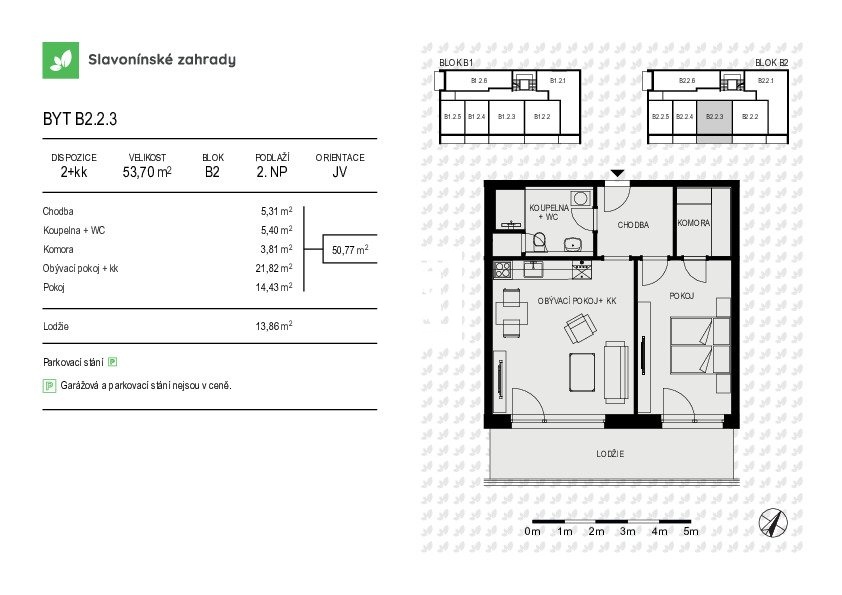 Z pověření developera Vám realitní kancelář ALLE reality&development s.r.o. v exkluzivním zastoupení nabízí již V. etapu úspěšného Projektu Slavonínské zahrady, jež navazuje prodejem – budovy B. Projekt umožňuje svým rezidentům dostupné bydlení v příjemné a klidné lokalitě města Olomouce. Více informací na webových stránkách alle. Byt B2.2.3 o dispozici 2+kk má podlahovou plochu 53,68 m² a terasa o velikosti 13,6 m² se nachází ve 2.NP bytového domu s nízkým počtem bytových jednotek. Velkou předností lokality je dostatek zeleně, odpočinková zóna kolem přírodního rybníku Hamrys, cyklistická stezka, to vše pro čas odpočinku. Skvělá občanská vybavenost, vynikající dostupnost MHD včetně nově prodloužené tramvajové tratě, a bezproblémový výjezd na dálnici naopak usnadní pracovní část dne. Vysoký komfort bydlení je zajištěn moderním standardním vybavením: podlahové vytápění po celé ploše jednotek, obložkové zárubně, vinylové podlahy, keramické obklady - vše dle volby klienta a také základní příprava pro venkovní žaluzie. Garážová stání a komory k dokoupení jsou samozřejmostí. Vyberte si své vysněné bydlení včas! Klient hradí nad rámec kupní ceny poplatek za právní a administrativní servis.
