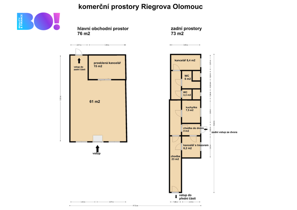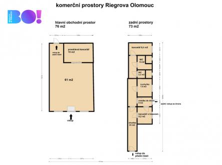 V exkluzivním zastoupení majitele Vám nabízíme k pronájmu obchodní prostory na velmi frekventovaném a prestižním místě ulice Riegrové v Olomouci. Jedná se o pěší zónu, takže je zde velmi hustá frekvence pohybujících se osob. Pokud tedy hledáte prostory, kde vás nepůjde přehlédnout, tak tyhle jsou ty pravé. Přední část o velikosti 76 m² nabízí otevřené obchodní či kancelářské prostory. Včetně stolů, skříní a židlí. Do prostoru vniká přes velká přední okna dostatek denní světla. Tyto prostory je možné chladit klimatizačními jednotkami. Na konci tohoto prostoru je prosklená kancelář, která má přehled na zbytek prostorů a dříve sloužila jako kancelář ředitele banky. V zadní části o velikosti 73 m² jsou dvě menší samostatné kanceláře či místnosti na jednání (s jedním trezorem). Dále pak kuchyňka s myčkou, dvě WC (muži, ženy), sprchový kout. Do této zadní části vede i druhý bezbariérový vstup přes vnitřní uzamykatelný trakt. Zde je možné uschovat kola či elektro koloběžky. Měsíční nájem je 35 000,- Kč. Kauce je ve výši 2 nájmů. Provize ve výši 1 platby. Zálohy: vodné 555,- Kč/měs. elektřina 6 070,- Kč/měs. plyn 8 300,- Kč/měs. Pokud Vás tato nabídka zaujala, tak nás kontaktujte a domluvíme si termín prohlídky.