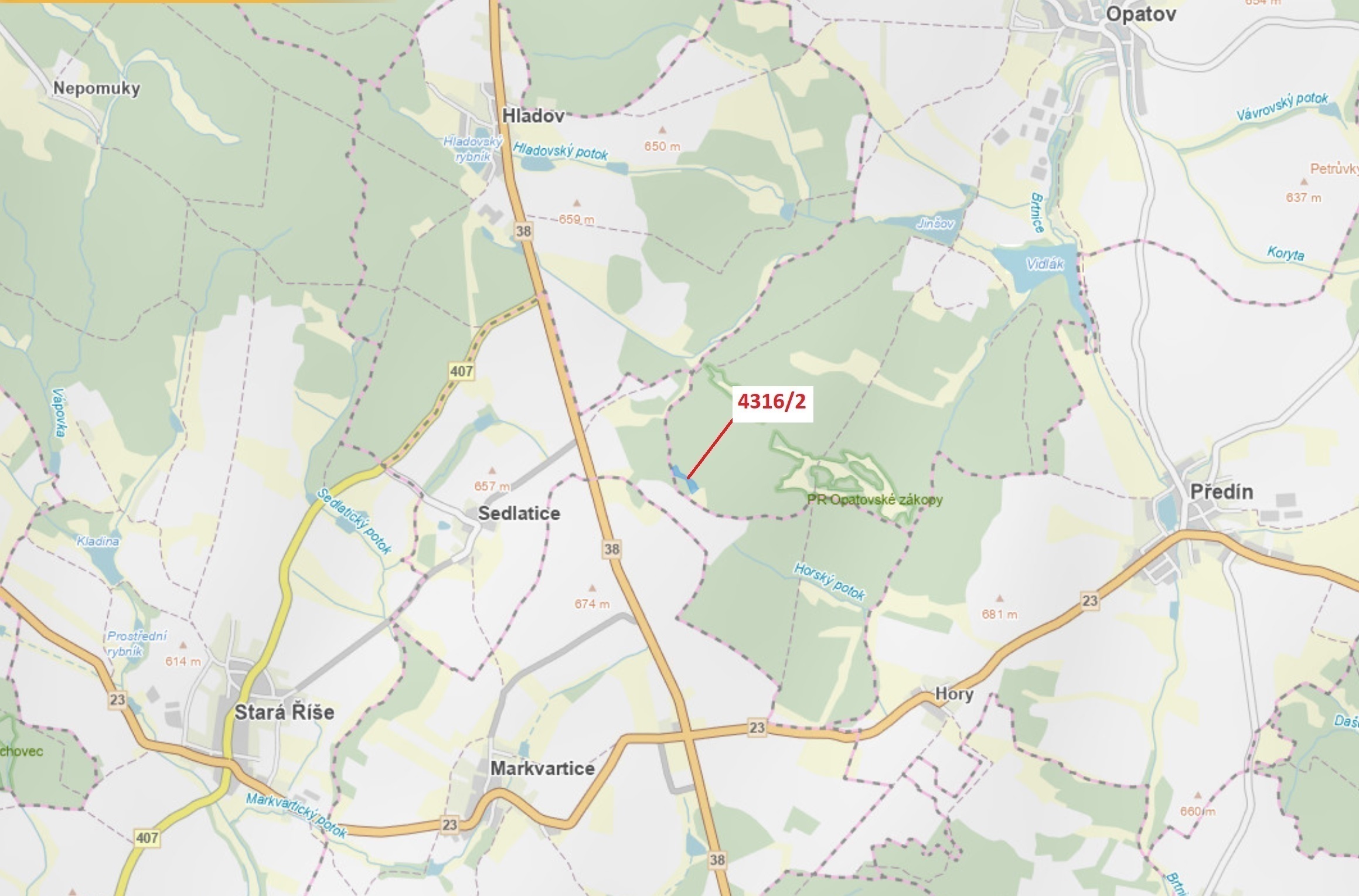 "Lesní pozemek o výměře 7085 m2, parcelní číslo 4316/2, podíl 1/1, katastrální území Opatov na Moravě, obec Opatov, obec s rozšířenou působností Třebíč, okres Třebíč, Kraj Vysočina. "