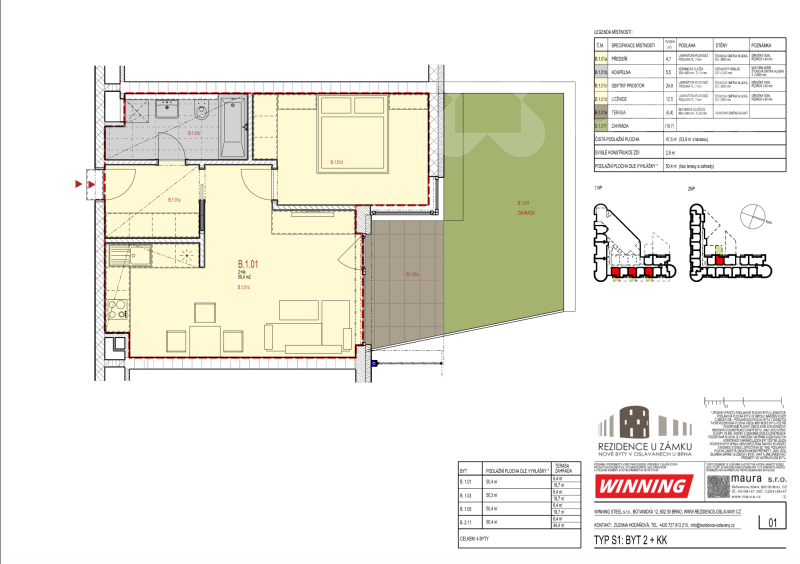 Nabízíme k prodeji krásný, světlý byt o dispozici 2+kk a výměře 50 m2, který se nachází v přízemí novostavby Rezidence u zámku v samém srdci Oslavan. Jeho součástí je prostorná terasa se zahrádkou o výměře 28 m2. K bytu je možné zakoupit parkovací stání přímo před domem. Jednotka je součástí moderního a oblíbeného projektu, který kombinuje klidné bydlení s historickým kouzlem zámeckého areálu, kdy hned za rezidencí vede pěší stezka kolem řeky Oslavy. Rezidence u zámku nabízí vysoký standard, bezbariérový přístup a kvalitní provedení s důrazem na úspornost a komfort. Dispozici tvoří prostorný obývací pokoj s kuchyňským koutem, ze kterého je přímý vstup na slunnou terasu se zahrádkou, dále ložnice a koupelna se sprchovým koutem a toaletou. Byt je prostorný, světlý a s výbornou energetickou náročností třídy B a nízkými provozními náklady. Lokalita nabízí kompletní občanskou vybavenost - v docházkové vzdálenosti jsou obchody, školka, škola, pošta i lékař. V okolí se nachází zámecký park, říčka Oslava, cyklostezky i sportovní areály. Velkým bonusem je blízkost Biotopu Oslavany - přírodního koupaliště a areálu u zámku, kde najdete biologicky čištěné koupací jezero, dětský vodní svět s brouzdalištěm, geopark, venkovní fitness a dětské hřiště. Do Brna se pohodlně dostanete autem přibližně za 30 minut. Výměry cca: Byt 50m2 Terasa 6m2 Zahrada 19m2 Sklep 5m2 Byt je ideální volbou pro ty, kteří hledají moderní a klidné bydlení v blízkosti přírody, ale zároveň chtějí zůstat na dosah města. Díky své dispozici, terase a parkování je vhodný i jako investice k pronájmu. Taktéž doporučujeme jako bydlení pro seniory. Výměry jsou pouze orientační. V případě zájmu o prohlídku či bližší informace mě neváhejte kontaktovat.