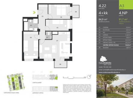 K prodeji Vám exkluzivně nabízíme byt 4.22 v oblíbeném developerském projektu – Rezidence park Hrabůvka v Ostravě. Bytový dům na ulici Hasičská je necelé čtyři roky po kolaudaci. Byt o dispozici 4+kk se nachází v posledním (4.NP) budovy. Má výměru 85 m2 + dva balkony. Přes prostornou chodbu s vestavěnou skříní vstupujete do obývacího pokoje s kuchyňskou linkou. Kuchyňská linka je vybavena vestavěnou lednicí s mrazničkou, myčkou nádobí, troubou na pečení, varnou indukční deskou, mikrovlnou troubou a digestoří. Z obývacího pokoje vystupujete na balkon, který je orientovaný do parku. Dále se v bytě nachází tři ložnice. V koupelně naleznete sprchový kout, vanu, umyvadlo, zrcadlo, otopný žebřík, přívod pro pračku a sušičku. Toaleta je samostatně. Veškerý nábytek je na míru dělaný z kvalitních materiálů v dekoru bílá/šedá. Podlahy a dveře jsou v dekoru světlý dub. Byt je nádherně prosluněný a působí vzdušně. Velká okna jsou osazena žaluziemi. K bytu náleží dvě vyhrazená parkovací stání přímo u domu + komora na patře (3 m2). Cena zahrnuje byt, dvě vyhrazená parkovací místa i komoru. Byt je k dispozici ihned. Vhodné jak pro vlastní bydlení, tak investici. Klient hradí nad rámec kupní ceny poplatek za právní a administrativní servis.