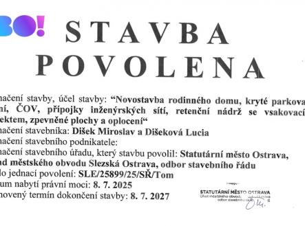 Výborná dostupnost do města a zároveň klid – a stavební povolení v ruce! Hledáte ideální místo pro svůj budoucí domov? Tento slunný stavební pozemek o výměře 1104 m² se nachází v lokalitě Ostrava-Bartovice, jen cca 600 metrů od Ozdravného centra Ještěrka. Klidná zóna a přitom výborná dostupnost do centra Ostravy. Pozemek je umístěn ve 2. řadě zástavby, což zajišťuje soukromí a odstup od hlavní silnice. Příjezd je zajištěn po soukromé přístupové cestě ve spoluvlastnickém podílu, s napojením na hlavní komunikaci. Velkým benefitem je platné stavební povolení, které novému majiteli umožní ihned zahájit výstavbu – žádné zdlouhavé vyřizování vás tedy nečeká. Projekt má tyto výměry: 1. Zádveří 7,70 m² 2. Samostatné WC 1,40 m² 3. Šatna 4,68 m² 4. Chodba 6,60 m² 5. Koupelna, WC 6,83 m² 6. Pokoj č.1 12,78 m² 7. Pokoj č.2 12,05 m² 8. Pokoj/pracovna 9,94 m² 9. Technická místnost 5,09 m² 10. Obývací pokoj/kuchyň/chodba 52,60 m² 11. Koupelna, WC 4,37 m² 12. Ložnice 19,34 m² 13. Garáž, Posilovna 24 m² Výhody lokality: - Výborné napojení na Ostravu (do centra autem cca 10 - 15 minut) - Klidné a bezpečné prostředí vhodné pro rodinné bydlení - V blízkosti příroda, lesy a rekreační možnosti Kompletní občanská vybavenost v dosahu – školy, školky, obchody, sportoviště. Tato lokalita je ideální volbou pro ty, kteří hledají rovnováhu mezi životem v přírodě a pohodlím města. Nechte se okouzlit atmosférou Bartovic a začněte stavět svůj vysněný domov bez zbytečných průtahů. Pro více informací nebo domluvení prohlídky mě neváhejte kontaktovat. Rád vám pozemek osobně představím.