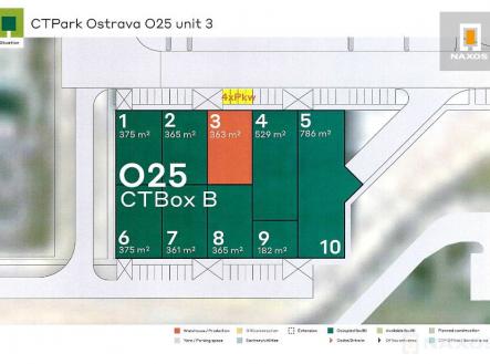 Pronájem jednotky CT Boxu-prostoru vhodného pro společnosti, které by rády skloubily skladové, výrobní, prodejní a kancelářské jednotky v jeden celek. Hotová jednotka má velikost 363 m2 a je ihned k nastěhování. Výška haly je 7 m, vjezdová úrovňová vrata mají rozměry 3,9 x 2,9 m. Podlahy jsou lité s nosností 500 kg/m2. Před budovou lze parkovat, k dispozici jsou 4 vyhrazená místa. Jednotku je možno označit viditelnou reklamou s logem dané společnosti. Objekt je dobře dostupný a viditelný z rychlostní komunikace R 56, ulice Místecká. Přesné umístění a kompletní kalkulace na vyžádání v RK.