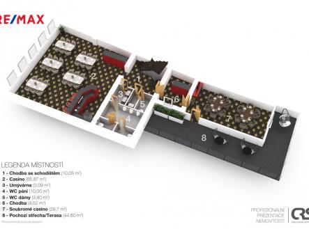 Jedná se o pronájem 3 podlažní budovy o užitné ploše 580 m2 v minulosti zde bylo kasíno. Nemovitost se nachází v centru města vedle hotelu Imperial. Lze využít jako obchod, restauraci nebo kanceláře, případně sídlo společnosti. V přízemí o užitné ploše 220 m2 se nachází otevřený prostor, bar, zázemí baru, dámské a pánské WC, malý sklada. V 1. patře o užitné ploše 162 m2 se nachází dvě velké místnosti, spojovací místnost, dámské a pánské WC a vstup na střechu, kterou lze využít jako terasu. V podkrovním podlaží o užitné ploše 118 m2 je velká předsíň, 3 samostatné místnosti, WC a malý sklad. Budova je vybavena vzduchotechnikou a klimatizací. Pozemek za budovou lze využít jako parkoviště pro 4 až 5 aut. Pronájem možný ihned.