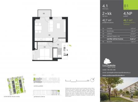 K pronájmu Vám nabízíme krásný byt s výhledem do parku v developerském projektu Rezidence park Hrabůvka. Jednotka s označením B4.01 je dispozice 2+kk s balkonem. Byt se nachází ve 4.NP čtyřpodlažní budovy s výtahem. Bytová jednotka má 42,7 m2 a balkon 3,4 m2. Byt je slunný s velkými francouzskými okny. Je vybaven kuchyňskou linkou na míru se všemi spotřebiči, jako vestavná lednice, mrazák, varná indukční deska, myčka, dále disponuje interiérovými žaluziemi. Součástí koupelny je prostorný sprchový kout a WC. K bytu náleží jedno vyhrazené venkovní parkovací stání a komora přímo na patře. PENB je B, tedy minimální měsíční náklady na vytápění a celkové náklady na bydlení v novostavbě jsou v dnešní době přidanou hodnotou. K dispozici ihned, doporučuji osobní prohlídku bytu.