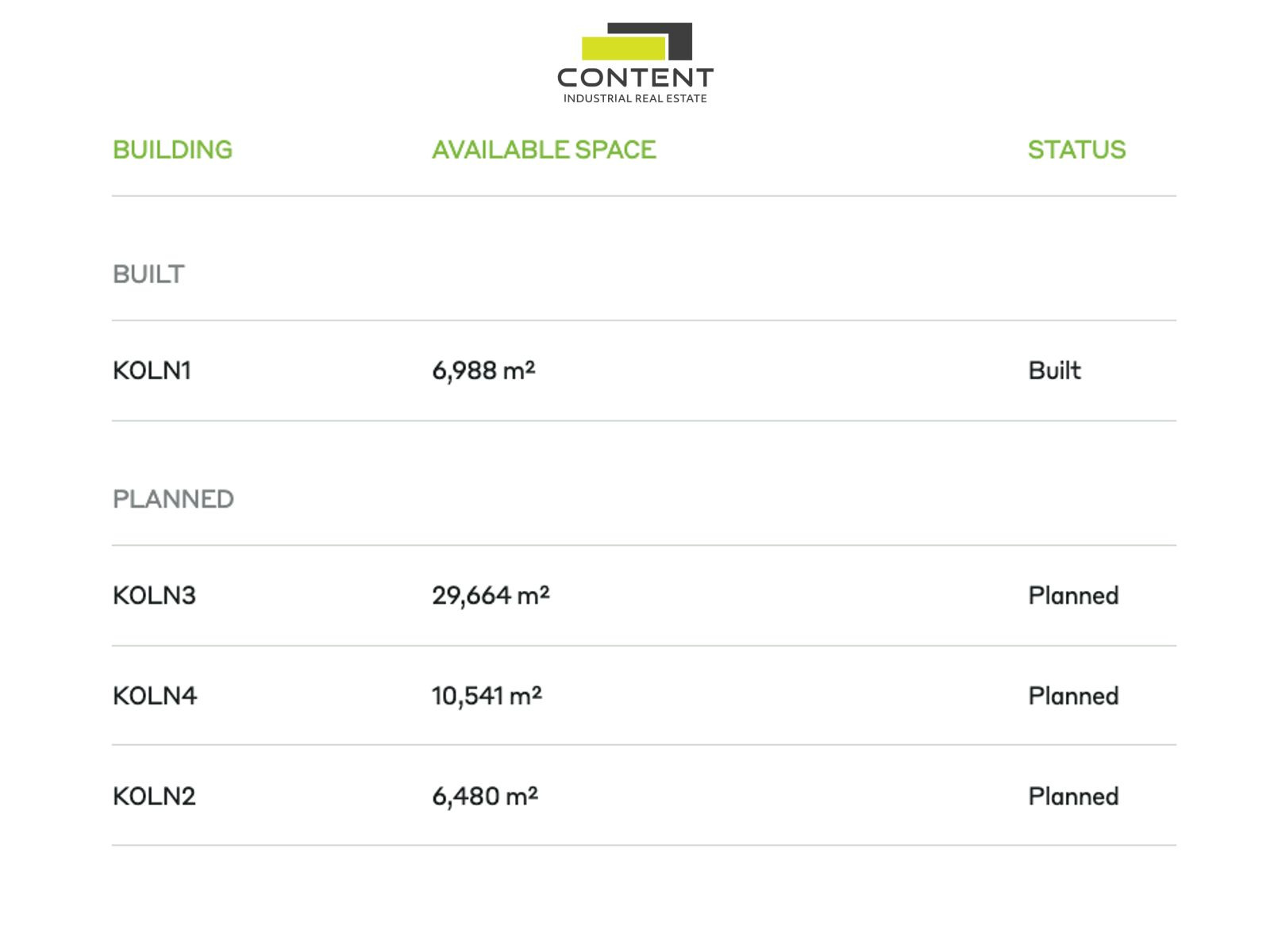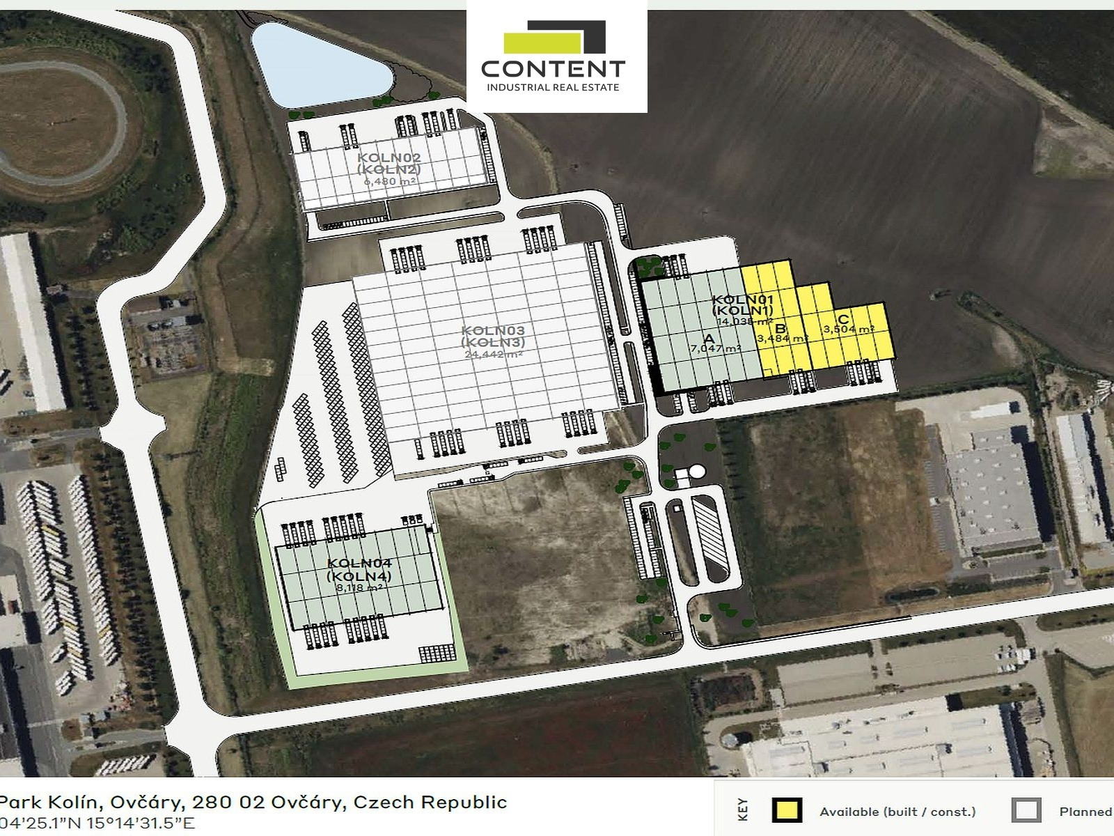 Pronájem skladu, výrobních prostor 24442 m² Kolín - Ovčáry, D11. V zastoupení majitele a bez provize nabízíme industriální prostory, vhodné pro sklad nebo výrobu, o celkové velikosti cca 30000 m² v rámci zcela nového industriálního parku, který je v těsné blízkosti výrobního závodu Toyota Motor Manufacturing. Lze je využít především pro skladování a výrobu. Svou polohou mají jednoduché napojení na dálnici D11, EXIT 42 a 50. - ve výstavbě, k dispozici dohodou - samostatná budova až 24442 m² (budova KOLN3) - prostory lze dělit na jednotky od cca 3000 m², dle požadavků - výška 10 m - vstupy v úrovni vozovky i pomocí hydraulických ramp - bezprašné podlahy s minimální nosností 7 t/m² - kanceláře, showroom, zázemí budou vestavěny na míru, dle potřeby - osvětlení technologií LED - další úpravy možné, dle potřeb konkrétního klienta - příjezd pro TIR samozřejmostí, dostatečné manipulační i parkovací plochy - v rámci areálu ihned k pronájmu cca 3500 m² Cena nájmu je individuální, bude stanovena dle dalších podmínek smlouvy. Fotografie hotového interiéru jsou pouze ilustrativní. Pro více informací nás kontaktuje, rádi Vám zajistíme prohlídku nemovitosti.