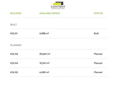 Pronájem novostavby skladu, výrobních prostor Kolín - Ovčáry, D11. V zastoupení majitele a bez provize nabízíme industriální prostory o velikosti 6988 m², umístěné v rámci zcela nového industriálního parku, který je v těsné blízkosti výrobního závodu Toyota Motor Manufacturing. Lze je využít především pro skladování a výrobu. Svou polohou mají jednoduché napojení na dálnici D11, EXIT 42 a 50. - ve výstavbě, k dispozici do 6 měsíců - samostatné industriální prostory až 6988 m² (budova KOLN1) - prostory lze rozdělit na jednotky 3484 m² + 3504 m², - výška 10 m - vstupy v úrovni vozovky i pomocí hydraulických ramp - bezprašné podlahy s minimální nosností 7 t/m² - kanceláře, showroom, zázemí budou vestavěny na míru, dle potřeby - osvětlení technologií LED - další úpravy možné, dle potřeb konkrétního klienta - příjezd pro TIR samozřejmostí, dostatečné manipulační i parkovací plochy - v rámci areálu možnost pronájmu až 60000 m² Cena nájmu je individuální, bude stanovena dle dalších podmínek smlouvy. Fotografie hotového interiéru jsou pouze ilustrativní. Pro více informací nás kontaktuje, rádi Vám zajistíme prohlídku nemovitosti.