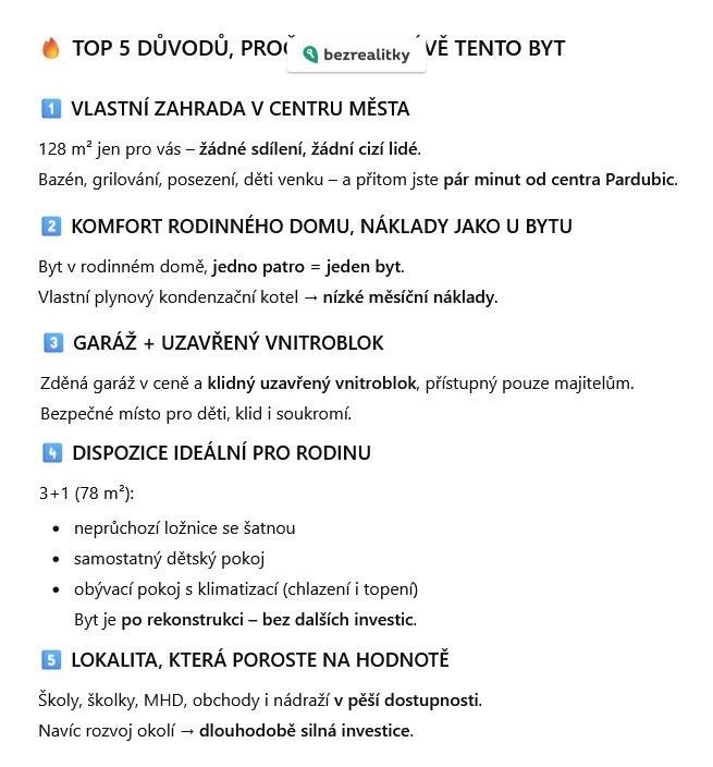 Nabízíme rodinné bydlení se zahradou v centru Pardubic 3+1 (78 m²) Za cenu 8 100 000Kč můžete mít: • Prostorný atypický byt 3+1 (78,41 m²) v rodinném domě • Vlastní oplocenou zahradu 128 m² ve výlučném užívání • Zděnou garáž (21 m²) • Sklep 10,06 m² • Bazén, trampolínu a zahradní domek s kuchyní a posezením. Vše se nachází v klidném uzavřeném vnitrobloku, přístupném pouze pro majitele domu. Byt je připravený k nastěhování a nachází se ve 3. nadzemním podlaží rodinného domu, kde platí jednoduché pravidlo: JEDNO PATRO = JEDEN BYT = maximální soukromí. DISPOZICE bytu nabízí: • světlý obývací pokoj s chytrou klimatizací (chlazení i topení) a stmívatelným LED osvětlením • kuchyň s jídelním stolem a kuchyňskou linkou na míru • neprůchozí ložnici s vlastní šatnou • neprůchozí dětský pokoj • velmi prostornou koupelnu • samostatné WC • vstupní chodbu s bezpečnostními dveřmi Byt prošel rekonstrukcí a je bez nutnosti dalších investic. ZAHRADA – místo, kde bude vaše rodina trávit čas Zahrada je skutečným srdcem této nemovitosti: • bezpečný prostor pro děti • letní koupání v bazénu • grilování s přáteli • posezení v zahradním domku s kuchyní To vše v centru města, ale mimo ruch ulic. Nízké provozní náklady! • vlastní plynový kondenzační kotel • dům z cihel • efektivní vytápění a chlazení Ideální lokalita pro rodinu! Klidná a vyhledávaná část Pardubic – ulice Železničního pluku. V pěší dostupnosti: • školy a školky • obchody • MHD a vlakové nádraží • nemocnice • Aquacentrum, divadlo, sportoviště SHRNUTÍ Tato nemovitost nabízí: • ideální rodinné bydlení - byt, kde děti mají prostor a rodiče klid. • vlastní zahradu v centru města • soukromí rodinného domu • nízké provozní náklady • garáž a bezpečný vnitroblok Máte zájem o prohlídku nebo více informací? Neváhejte mě kontaktovat. V případě více zájemců si prodávající vyhrazuje právo vybrat nejvýhodnější nabídku. Tato nemovitost je určena výhradně přímým zájemcům o koupi. Na inzerát můžete také reagovat přímo na webu Bezrealitky: https://www.bezrealitky.cz/nemovitosti-byty-domy/982655-nabidka-prodej-bytu-zeleznicniho-pluku-pardubice
