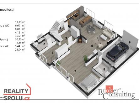 Prodej rodinného domu 206 m2, pozemek 445 m2, Pchery Pokud hledáte lokalitu, kde se Vám bude fantasticky bydlet a nebude se Vám odsud chtít nikam odjíždět, tak jste tady správně. Vítejte v malebné obci Pchery u Kladna, pouze 15 minut autem od kraje Prahy a od letiště. Nabízíme Vám k prodeji rodinný dům s dispozici 4 + kk s garáží (21,04 m2) a sklepem (4,12 m2), který prošel kompletní a velmi důkladnou rekonstrukcí zahrnující výměnu krovu, střešní krytiny, oken, omítek, podlah, kompletních rozvodů elektřiny, vody a odpadů. A samozřejmě byl zcela přebudován systém vytápění. Výsledkem je moderní, nadčasové a elegantní prostory pro skvělé bydlení. Dům je nízkoenergetický, zateplený, opatřený solární elektrárnou s výkonem 8,25 kWp, včetně bateriového systému (10 KwH), tepelným čerpadlem a vlastní studnou. Život v něm bude opravdu nízkonákladový. Pozemek má celkem 445 m2, z toho zastavěná plocha domu je 138,75 m2. Po vstupu do domu hlavním vchodem se ocitnete v zádveří a navazující chodbě (12,13 m2 + chodba 9,83 m2), ze které můžete pokračovat dále do koupelny s toaletou (6,69 m2), nebo do velmi prostorné haly s kuchyní, jídelnou a obývacím pokojem s krbem (66,24 m2). Přes francouzská okna je možné vyjít přímo na terasu a zahradu. V přízemí se ještě nachází ložnice (14,45 m2 + chodba 2,93 m2) s vlastní koupelnou se sprchovým koutem (5,44 m2) a také odtud je možný vstup na terasu. V horním patře je pracovna (9,68 m2), šatna (7,52 m2) a otevřený prostor s přiznanými trámy (47,84 m2). A i zde se nachází samostatná terasa (cca. 37,65 m2) přístupná z tohoto podlaží. Nemovitost nabízí i zcela výjimečný venkovní prostor, který je od okolí oddělen zděným a dřevěným plotem a který dodává majitelům dostatek soukromí a pocit nerušenosti. Udržovaná zahrada s jezírkem a zelení doplněná zastřešeným bazénem 4,5 x 3,5 m se slanou vodou a protiproudem (MTF74 3 F/Pool Jet), přímo vybízí k odpočinku či zahradničení. Je zde také přístřešek pro skladování potřebného nářadí, zahradního nábytku či grilu. Veškeré inženýrské sítě nemovitosti jsou napojeny na obecní vodovod, splaškovou kanalizaci a veřejnou elektrickou síť. Výborná dopravní dostupnost. Za 20 minut autem jste v Praze na letišti nebo na Evropské. Pouze 5 minut od Kladna. V okolí je vše potřebné pro kvalitní život. Tato nemovitost opravdu stojí za prohlídku, těším se na Vás!