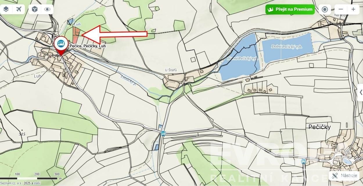 Prodej pozemku 2330m2 v obci Luh u Pečiček, pozemek se skládá z parcely pro výstavbu RD, a okolních luk a lesa. Samotná parcela pro stavbu má velikost 980m2. Podle Územního plánu je povolena zastavitelnost této parcely do 35%, tedy cca 340m2, typická venkovská zástavba, případně i pro rekreační účely. Na pozemku elektřina, na vodu nutno vybudovat vrtanou studnu a na odpady jímku, nebo domácí čističku. Malá klidná obec. Do obce zajíždí školní autobus , v Milíně 3,5km základní škola a mateřská školka. Obchod, restaurace, obecní úřad a pošta a kino. Na dálnici na Prahu 5 minut.