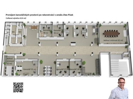 Nabízím Vám příležitost pronajmout si modernizované kancelářské prostory o výměře 614 m2 v areálu Jitexu Písek. Tato nabídka je ideální pro podnikatele, kteří chtějí prvotřídní pracovní prostředí a moderní zázemí pro svoji firmu. Ať už hledáte optimální a moderní pracovní prostředí pro Vaši firmu nebo přesun kanceláří z centra města s výraznou úsporou a chcete dostatek prostoru pro váš rozvoj, zde najdete řešení. Hlavní výhody, které Vás přesvědčí: Prostory po rekonstrukci: kancelářské prostory prošly nedávnou kompletní rekonstrukcí, což znamená, že můžete očekávat čerstvé a moderní prostředí pro Váš podnik. Moderní zázemí: systém kanceláří, jednacích místností a společných prostor je poměrově dobře kombinován. Prostory mají kompletně nové rozvody a to včetně datových sítí, což zajistí efektivní a bezproblémový chod Vašeho podnikání. Přístup 24/7: vaše podnikání často nemá pracovní hodiny. S našimi kancelářskými prostory získáte neomezený přístup 24 hodin denně, 7 dní v týdnu. Dostatek parkovacích míst: nemusíte se starat o parkování. Dostatek parkovacích míst je přímo před budovou. Možnost stravování: pro pohodlí vašich zaměstnanců a efektivitu provozu nabízíme možnost stravování přímo v budově, což ulehčí každodenní provoz vašeho podniku. Náklady na energii a vodu jsou účtovány dle měření skutečné spotřeby na základě samostatného poměrového měření. Při podpisu nájemní smlouvy požaduje pronajímatel složit vratnou jistotu (kauci) ve výši třech nájmů. Pro více informací a prohlídku kontaktujte mě telefonním čísle nebo e-mailu uvedeném níže v nabídce. V areálu můžeme nabídnout prostory i v jiných objektech o různých výměrách a způsobu využití, neváhejte mě kontaktovat.