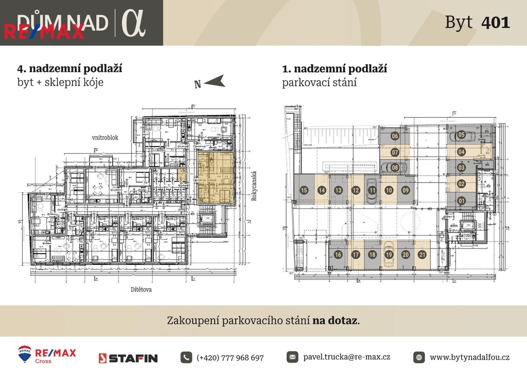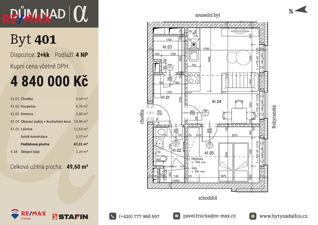 4.01 Nabízíme k prodeji moderní byt 2+kk s bezbariérovým přístupem, který se bude nacházet ve IV. NP novostavby s výtahem, která vzniká v Plzni na Doubravce na křížení ulic Dítětova a Rokycanská v blízkosti Divadla Alfa. Celková užívaná plocha činí 49,60 m2 a sestává z podlahové plochy bytu 47,31 m2 vč. svislých konstrukcí 3,37 m2 a sklepní kóje na patře o výměře 2,29 m2. Tento byt tvoří obývací pokoj s prostorem pro kuchyňskou linku o výměře 19,96 m2, ložnice o výměře 11,63 m2, koupelna se sprchovým koutem a WC o výměře 4,76 m2, komora o výměře 3,00 m2 a chodba o výměře 4,59 m2. Momentálně si lze v uvedené ceně vybrat doplňky jako podlahové krytiny, dekor dveří, obklady, dlažby a sanitu, a to ze zvolených standardů, popř. si připlatit za jiné dle vašeho výběru. Tento byt s jižní orientací bude vybavený ventilační jednotkou s rekuperací, díky níž nemusí uživatel provádět výměnu vzduchu v bytě otevřením oken. Ve společném garážovém prostoru se bude nacházet několik parkovacích míst, o jejichž aktuální dostupnosti Vám poskytneme více informací na dotaz. Energeticky chytrý dům – moderní kombinace plynového zdroje tepla a FVE umístěné na střeše objektu = výjimečný systémem zajišťující uživatelům levnější provoz rozdělováním výroby elektrické energie použité v bytech, společných prostorách a následně pro ohřev vody na TUV a teplo v kotelně. Jelikož se jedná o moderní dům, energetická náročnost budovy vychází na B, okna jsou plastová s izolačními trojskly, el. v mědi (230 V / 380 V do kuch. koutu), rozvody vody a kanalizace v plastu, dveře a zárubně zn. Sapeli a domofon s funkcí videofonu. Pro případné venkovní stínění na elektrický pohon je provedena elektroinstalace s přerušeným tepelným mostem. Dům bude disponovat optickým rozvodem pro internet. Kupní cena je uvedena vč. DPH. Více informací lze zjistit na webových stránkách projektu nebo u makléře nabídky. Stavba má být dokončena v červenci 2027, zkolaudována a k nastěhování od října 2027. Investorem a generálním dodavatelem celého projektu je společnost STAFIN a.s.