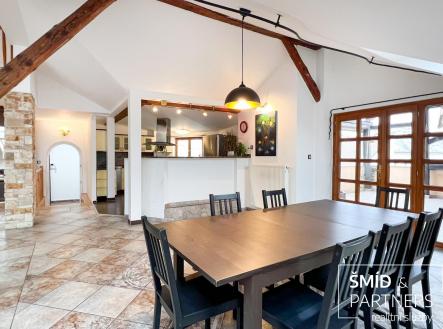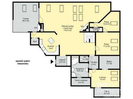 Nabízíme k prodeji s výraznou slevou 500.000.-Kč krásný a skutečně prostorný podkrovní mezonetový byt s terasou s dispozicí 5+kk o ploše 245 m2. Byt se nachází ve 4NP komerčního a bytového domu v Martinské ulici necelých 400m od Náměstí Republiky. K bytu náleží užívání zastřešené 26 m2 velké terasy s grilovacím krbem. Dominantou bytu je více jak 110 m2 velká centrální místnost, která je dělená na kuchyňský kout, jídelnu, obývací část a halu. Kuchyňský prostor je spíše velkou kuchyní se středovým ostrůvkem, vlastním oknem, spíží a samostatným vstupem na terasu. Definici kuchyňského koutu naplňuje oddělením prostoru od jídelny zděným barem. Jídelní části dominuje prosklený výhled skrze široké dvoukřídlé dveře vedoucí na terasu. Obývací část opticky odděluje trámová konstrukce krovu a také snížená podlaha v této části. Za tímto prostorem v místech, kde již podlaha zase vystupuje, je kout se střešním oknem, knihovnou a vstupem do jedné z ložnic. Tato ložnice disponuje vlastním sociálním zařízením (sprchový kout, umyvadlo, toaleta). Tento pokoj je průchozí a pokračuje do další z ložnic s plochou vice jak 17 m2. Do poslední ložnice v tomto podlaží se vstupuje chodbou, ze které je také přístupna hlavní koupelna. Zadní ložnice o 15 m2 disponuje velkými šatnami a vlastním vchodem do hlavní koupelny. Koupelna je natolik prostorná, že je zde rohová vana i sprchový kout a dvě protilehle umístěná velkorysá umyvadla. Na koupelnu navazuje vstup do technické místnosti, kde jsou potřebná připojení na pračku a sušičku i dostatek prostoru pro nutné úklidové vybavení. V technické místnosti se nachází plynový kotel zn. Bosch, který je starý dva roky, s možností dálkového ovládáním chytrým telefonem. Zajišťuje vytápění i ohřev TUV. Z haly pak vede dřevěné točité schodiště do mezonetové části s galerií a ložnicí. Tento pokoj je mino střešních oken prosvětlen také dvojící vikýřů opatřených elektrickými předokenními žaluziemi. O dům je SVJ velmi dobře pečováno. Nová střecha byla instalována v roce 2017, dům má z průčelí renovovanou fasádu a v blízké budoucnosti se chystá revitalizace fasády směřující do vnitrobloku. Dům nedisponuje výtahem, ale pro transport břemen do cca 150 kg je zde instalován elektrický vrátek, který lze ovládat z každého podlaží. Dostatečně široké schodiště tak nebude nutné využívat pro přenos těžkých nákupů. Vstup do domu je přes pasáž, která je opatřena časově ovládanou mříží pro automatické uzavření domu v nočních hodinách . Mříž lze ovládat instalovaným domovním interkomem, a tak jí příchozím a odchozím návštěvám můžete otevřít z pohodlí bytu. Měsíční předpis záloh, který zahrnuje fond oprav, úklid spol. prostor, svoz komunálního a recyklovaného odpadů, pojištění domu, správu domu, el. spol prostor a zálohy na vodné a stočné, činí 8 097 Kč. Spotřeba plynu byla za poslední fakturované období jednoho roku ve výši 22.8mWH - vytápění a ohřev TUV. Financování hypotéčním úvěrem Vám naše kancelář ráda zajistí. Jan Česal
