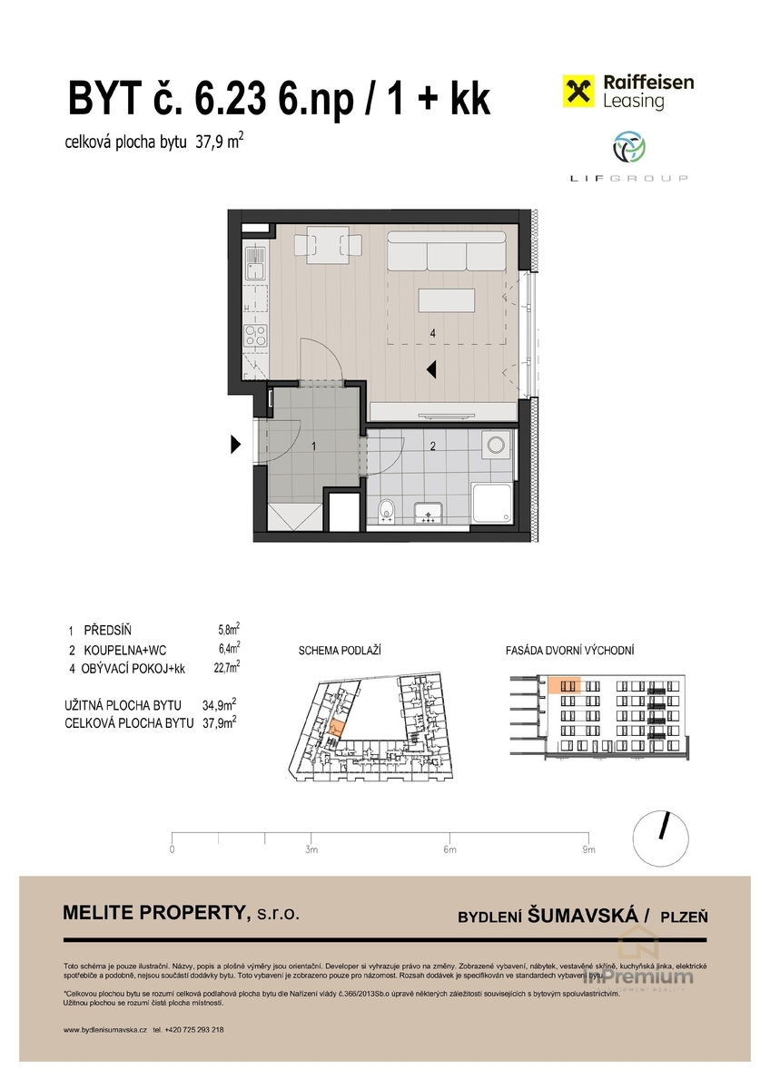 Nabízíme byt č. 6.23 o dispozici 1+kk s celkovou plochou 37,9 m² v 6. nadzemním podlaží novostavby Bydlení Šumavská v Plzni. Byt je ideální volbou pro vlastní bydlení i jako investice – představuje poslední malometrážní byt tohoto typu v celém projektu. Obývací pokoj s kuchyňským koutem (22,7 m²) nabízí dostatek prostoru i pro jídelní nebo pracovní zónu. Součástí bytu je koupelna s toaletou a vstupní předsíň s místem pro úložné řešení. Sklepní kóje je již zahrnuta v ceně. Projekt se nachází v klidné části centra Plzně a jeho dokončení je plánováno na podzim 2027. Byty jsou nabízeny v moderním standardu s možností klientských změn. Nezmeškejte poslední příležitost k pořízení kompaktního a praktického bytu v rámci oblíbeného projektu v širším centru Plzně.