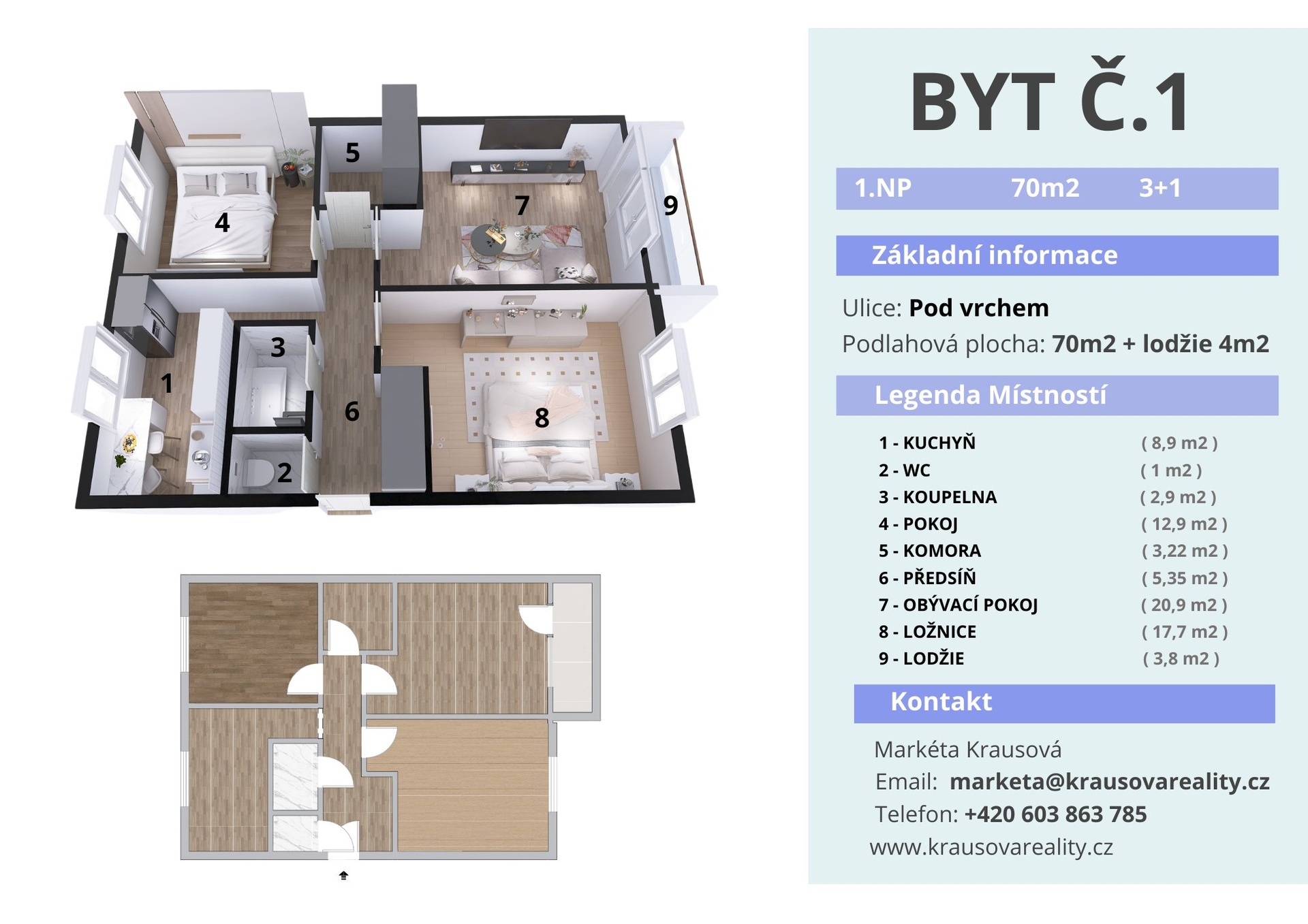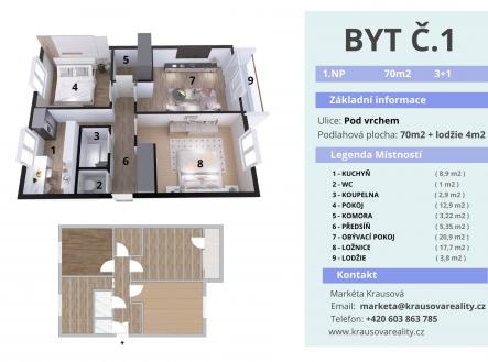 Popis nemovitosti Představuji Vám k prodeji byt o dispozici 3+1 po částečné rekonstrukci v revitalizovaném cihlovém domě v klidné lokalitě plzeňské čtvrti Lobzy. Byt informace: - dispozice 3+1, 70 m2 - 1. patro - orientace bytu – východ (2 pokoj), západ – 2 pokoje - okna plastová - ihned k dispozici - topení - dálkově - plyn zaveden (sporák) - teplou vodu zajišťuje lokální zdroj – plynová karma - elektřina původní, nové rozvody pouze v kuchyni - příprava na kuchyňkou linku - sklep 4 m2 - lodžie 4 m2 Byt disponuje předsíní, komorou, 3 pokoji, kuchyní, samostatným wc a koupelnou. K bytu náleží lodžie a sklepní jednotka. Byt se nabízí bez vybavení, kuchyňská linka není součástí. V kuchyni je pouze příprava na umístění nového vybavení. Byt se nachází v prvním patře, jedná se ovšem o druhé nadzemní podlaží. V prvním podlaží jsou garáže a společné prostory jako je sušárna, kolárna, sklepy, apod. Dům informace: - cihlový dům po kompletní revitalizaci Dům je po dokončené revitalizaci - nová fasáda, lodžie, zateplení – provedené v loňském roce, vstupní dveře, zvonky. Lokalita: Dům se nachází v klidné lokalitě plzeňské čtvrti Lobzy. V okolí je dostatek místa na parkování. Za domem krásný park se vzrostlými stromy a atrakcemi pro děti. V těsné blízkosti jsou obchody s potravinami, nákupní středisko ´Centrum´, či vzdálenější Obchodní centrum Rokycanská, mateřská škola, základní škola, restaurace, lékárna, pošta, zastávky MHD a mnoho dalšího. Pro koupi bytu Vám zajistím kompletní realitní a právní servis a v případě potřeby i výhodné financování hypotečním úvěrem.
