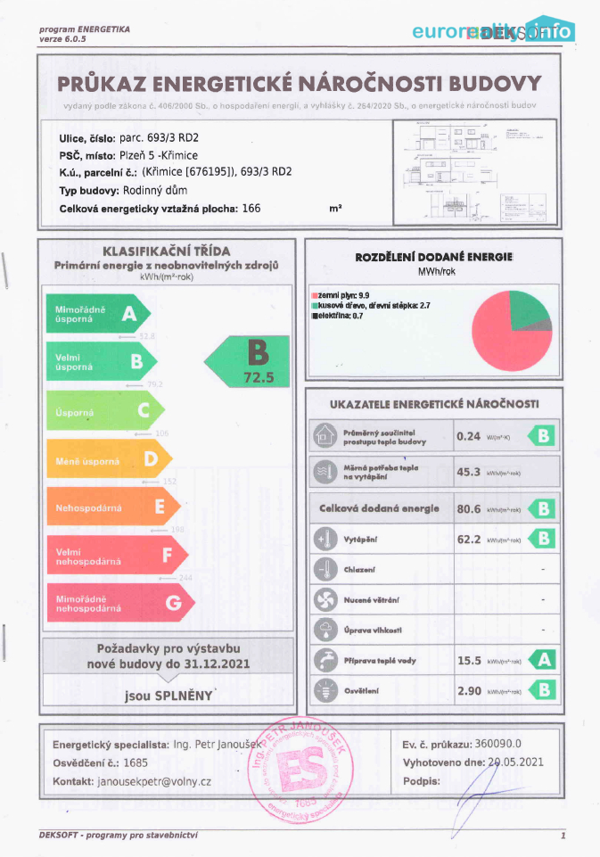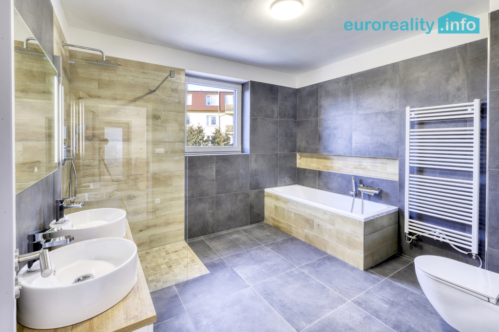 Nabízíme k prodeji nadstandardně zpracovanou novostavbu moderního rodinného domu se samostatnou konstrukcí o dispozici 5+kk . Kolaudace proběhla v roce 2024. Dům se nachází v klidné a vyhledávané části Plzně – Křimice. Nabízí komfort novostavby, vysoký standard provedení a příjemné rodinné bydlení s vlastní zahradou. V ceně jsou rozvody pro solární panely a pro tepelné čerpadlo. Dům je součástí dvojice domů postavených vedle sebe, přičemž je konstrukčně plně oddělený dilatační spárou, bez společných obvodových stěn a bez společné střešní konstrukce. Dům má samostatné přípojky inženýrských sítí, vlastní pozemek i oplocení, což zajišťuje vysokou míru soukromí a bydlení srovnatelné se samostatně stojícím rodinným domem. Celková užitná plocha domu činí 130 m², zastavěná plocha je 106 m² a pozemek má výměru 266 m², z toho zahrada cca 160 m². Dům má dvě nadzemní podlaží a prakticky řešenou dispozici vhodnou pro rodinné bydlení. V přízemí se nachází prostorný obývací pokoj s kuchyňským koutem a přímým vstupem na terasu a zahradu, dále vstupní hala, technická místnost, spíž a samostatná toaleta. V obývacím pokoji je připraven komín s přívodem čerstvého vzduchu pro instalaci krbových kamen. V patře jsou umístěny ložnice a další pokoje, koupelna s toaletou a vstup na horní terasu o ploše cca 18 m², která nabízí příjemný prostor pro relaxaci. Dům je napojen na veškeré inženýrské sítě – vodovod, veřejnou kanalizaci, plyn a elektřinu (230/400 V). Vytápění a ohřev vody zajišťuje plynový kondenzační kotel v kombinaci s podlahovým vytápěním. Připravena je kompletní elektroinstalace pro budoucí technologie, jako jsou solární panely, tepelné čerpadlo, zabezpečovací systém, kamerový systém či chytrá domácnost. Součástí je také retenční nádrž na dešťovou vodu. Energetická náročnost budovy je hodnocena jako velmi úsporná. Velkou výhodou lokality je rychlé napojení na plzeňský obchvat, které zajišťuje výbornou dostupnost do centra Plzně i na dálnici. Samotný dům je však situován tak, že dopravní provoz nemá negativní vliv na klid bydlení, což si zájemci často ověřují přímo při osobních prohlídkách. Nemovitost představuje ideální kombinaci klidného bydlení, soukromí a výborné dostupnosti města. Oproti bytu nabízí vlastní zahradu, žádné SVJ, žádné společné prostory a parkování přímo u domu. V případě zájmu o více informací nebo osobní prohlídku nás neváhejte kontaktovat. S financováním pomůžeme.