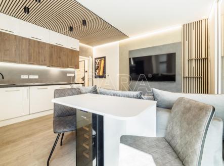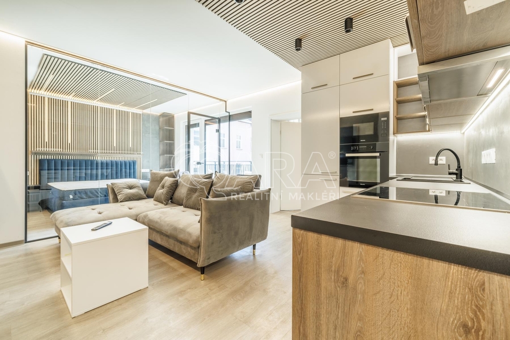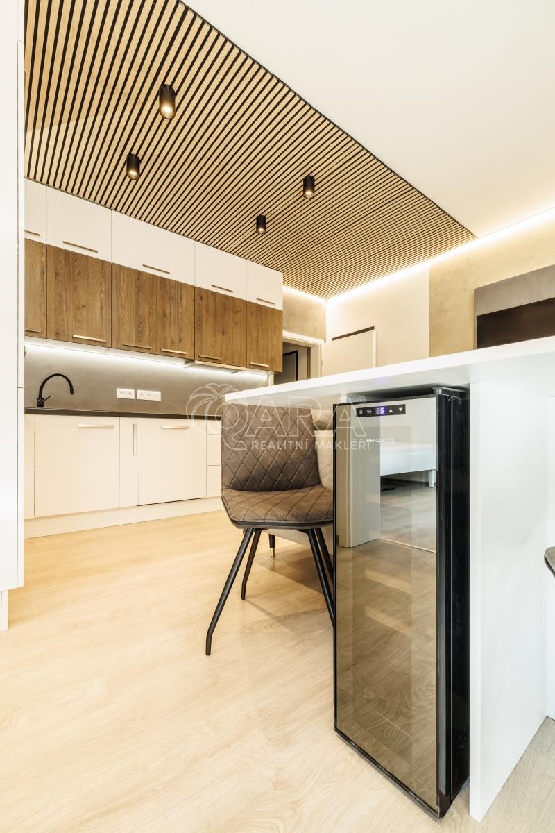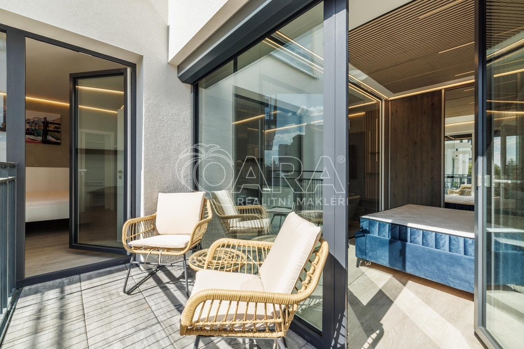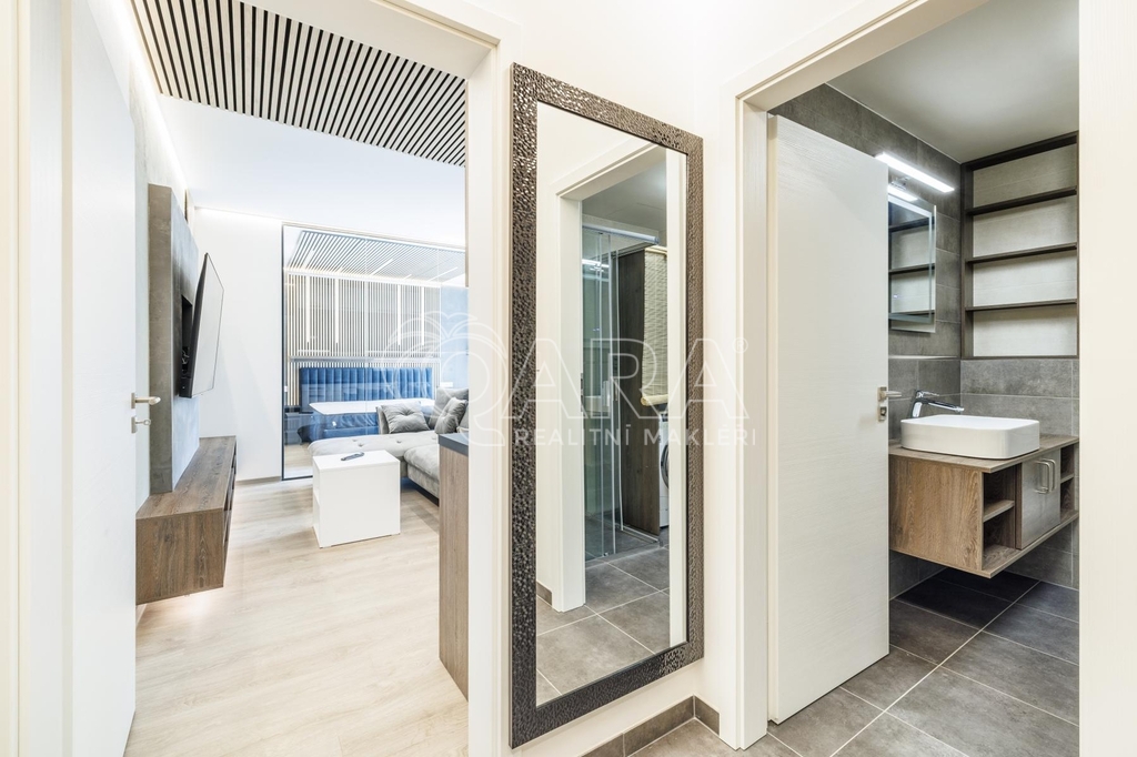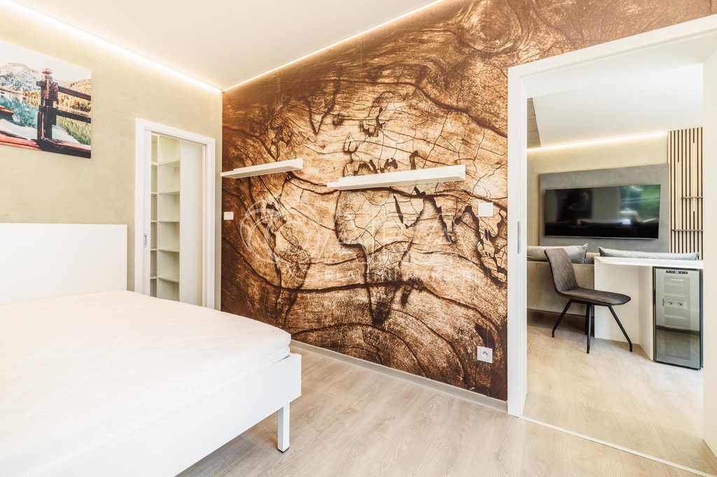 Hledáte absolutní špičku mezi nájmy v Plzni? Nabízíme k pronájmu technologicky vyspělý, kompletně zařízený byt o dispozici 3+kk (60 m²) s balkonem a garážovým stáním. Tato novostavba z roku 2023 v ulici Na Jíkalce představuje dokonalou symbiózu moderního designu, chytrých technologií a soukromí, a to jen pár kroků od historického centra města. Interiér, který ovládáte svým telefonem Byt je navržen pro náročné nájemníky, kteří ocení špičkové materiály a automatizaci pro každodenní komfort: Smart Kuchyně & Obývací prostor: Kuchyňská linka je osazena prémiovými spotřebiči značky Miele (myčka, horkovzdušná a mikrovlnná trouba, indukční varná deska a digestoř), které lze ovládat na dálku pomocí aplikace. Součástí obývacího prostoru je designový jídelní stůl s integrovanou vinotékou, pohodlná sedací souprava a TV. Designová ložnice: Dominantou je stylová prosklená příčka, která prostoru dodává vzdušnost. Pro naprosté soukromí lze využít elektrické zatemňovací závěsy. Postel disponuje efektním podsvícením na pohybový senzor. Variabilní druhý pokoj: Pokoj s vlastním pracovním místem u okna a samostatnou šatnou poslouží skvěle jako pracovna, dětský pokoj nebo zázemí pro hosty. Oba pokoje mají přímý vstup na balkon orientovaný do klidného vnitrobloku. Koupelna: Elegantní provedení se sprchovým koutem, bidetovou sprškou a setem pračky se sušičkou. Komfort doplňuje vyhřívané zrcadlo s úpravou proti mlžení. Technologie pro váš komfort a bezpečí Chytrý přístup: Vstupní dveře s elektronickým zámkem (přístup přes kód, otisk prstu nebo aplikaci) – ideální pro dálkové udělení vstupu návštěvě či službám. Tepelná pohoda: Podlahové vytápění v celém bytě a elektrické zatemňovací žaluzie v hlavních místnostech pro dokonalý spánek. Světelný komfort: Noční orientační světla a senzory pohybu v předsíni zajišťují bezpečný pohyb bytem i za tmy. Exkluzivní zázemí rezidence K bytu náleží vlastní kryté garážové stání (zakladač). Rezidenti mají navíc výhradní přístup do privátní zahrady ve vnitrobloku – oázy klidu uprostřed města, kterou využijete pro relaxaci i setkávání. Tento byt není jen místem k přespání, je to životní styl pro ty, kteří chtějí mít technologie pod kontrolou a centrum Plzně na dosah ruky.