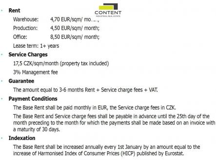 Pronájem skladu, výrobních prostor 16735 m² Plzeň - Borská pole. V zastoupení majitele a bez provize nabízíme prostory, vhodné pro sklad, výrobu i velkoobchod, v industriální zóně Plzeň - Borská pole, s výborným napojením na D5. - existující budova, k dispozici ihned - moderní, úsporná budova s certifikátem udržitelnosti BREEAM - k pronájmu samostatné jednotky 1000 - 16735 m² - prostor o velikosti 2000 m² lze využít i jako prodejnu/showroom - denní světlo dle norem, vytápění plynem - světlá výška 5,5 - 8 m - podlahy s nosností minimálně 5 t/m² - sprinklery - kryté rampy i vjezdy v úrovni vozovky - příjezd a parkování TIR bezproblémové - sociální zázemí a kanceláře jsou k dispozici v rámci objektu, dle specifikace nájemce až 6000 m² - výborně přístupné veřejnou dopravou - dostatek parkovacích míst Cena nájmu je individuální, dle dalších podmínek smlouvy. Indikativní ceny ve fotodokumentaci. Pro více informací nás kontaktujte, rádi Vám zajistíme prohlídku nemovitosti.