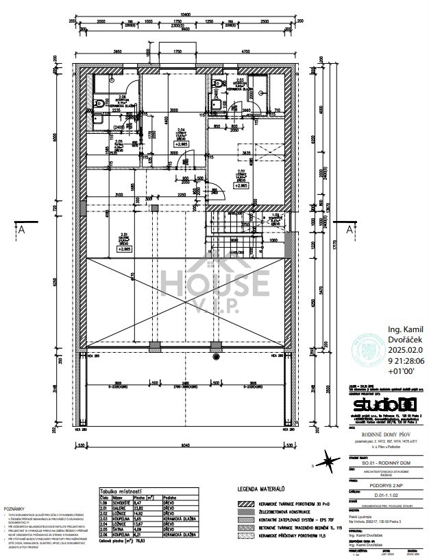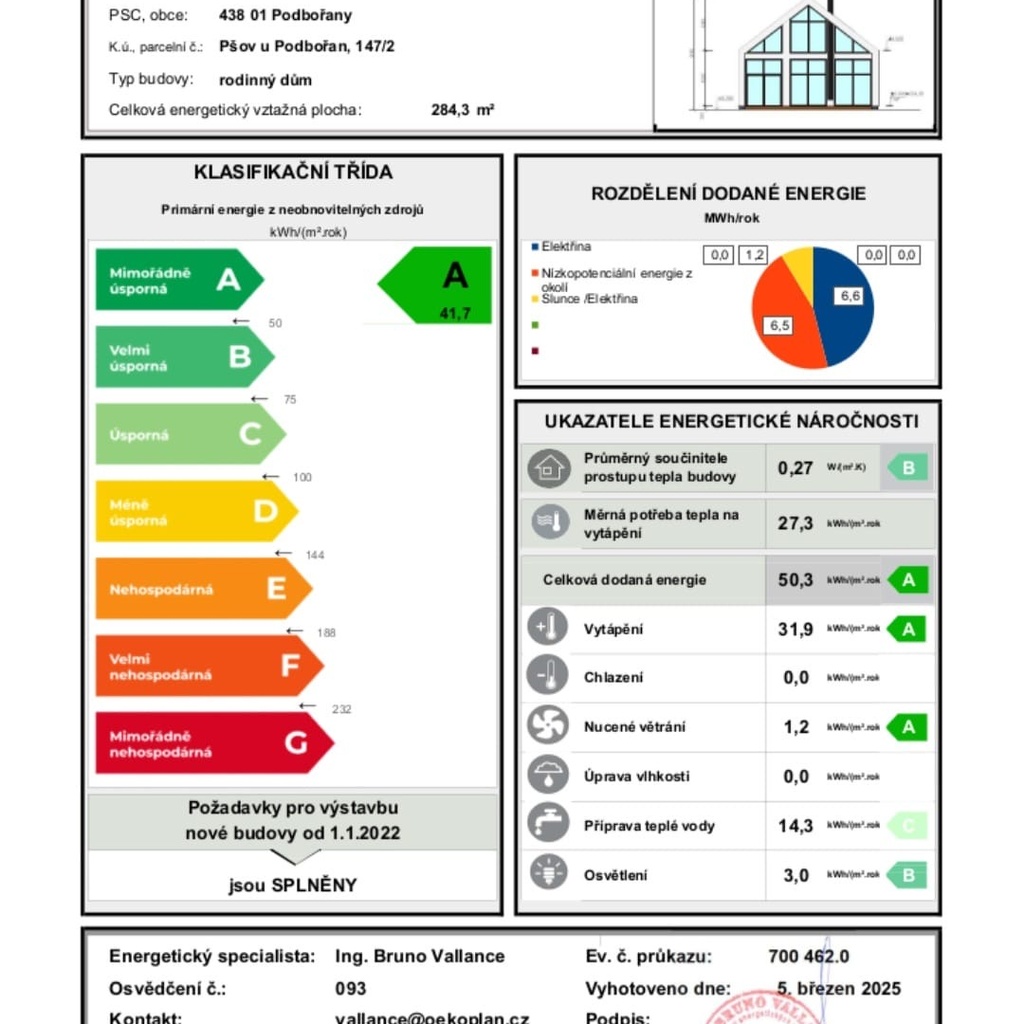 Nabízíme k prodeji moderní rodinný dům na klíč 4+kk, o užitné ploše 194 m², který bude realizován na slunném pozemku o výměře 1 000 m², v klidné části obce Podbořany s krásným výhledem do zeleně. Projekt je připravován ve vysokém standardu přímo vlastníkem pozemku, s důrazem na kvalitu použitých materiálů, energetickou úspornost a komfortní bydlení. Schválení stavebního povolení očekáváme začátkem roku 2026. Výstavba a cena: Cena zahrnuje pozemek a realizaci hrubé stavby (základy, nosné konstrukce, střecha, zateplení, okna, dveře, schodiště). Za příplatek je možné dokončit dům přesně dle vizualizace a požadavků kupujícího. Na prodej je také sousední pozemek včetně realizace o stejné výměře 1 000 m² (viz koordinační výkres). Je také možné koupit pozemek ihned s hotovým projektem a stavebním povolením za 2.49 mln. s možností samostatné realizace. Financování stavby je možné rozdělit na jednotlivé etapy, takže celou částku nemusíte platit najednou. Zastavěná plocha: 178,57 m². Podlahová plocha: 194,25 m². • 1. NP: 117,42 m² + terasa 35,79 m². • 2. NP: 76,83 m². Výška stavby: 8,86 m. Konstrukce: nosné stěny z dutinových keramických tvárnic. Strop nad 1. NP: železobetonový monolit (tl. 250 mm). Vytápění: tepelné čerpadlo + krbová vložka. Další technologie: fotovoltaika, klimatické zatížení řešeno v projektu. Přípojka vody: ze stávající studny. Kanalizace: domovní ČOV. Dispozice 1. NP (117,42 m²): Technická místnost (6,81 m²), WC (5,22 m²), spíž (7,54 m²), vstupní hala (13,63 m²), ložnice (12,37 m²), šatna (5,73 m²), druhá šatna (5,91 m²), obývací pokoj s kuchyňským koutem (60,21 m²) a terasa (35,79 m²). Dispozice 2. NP (76,83 m²): Schodiště (8,47 m²), galerie (23,82 m²), ložnice (14,92 m²), koupelna (5,65 m²), druhá ložnice (13,67 m²), šatna (4,09 m²) a koupelna (6,21 m²). Lokalita: Nemovitost se nachází v tiché části obce, pouhých 350 m od autobusové zastávky směr Žatec. Podbořany nabízejí plnou občanskou vybavenost, dobrou dostupnost do větších měst a krásné okolí ideální pro rodinné bydlení. Energetická náročnost: Budoucí PENB bude odpovídat hodnotám nízkoenergetického až pasivního domu třídy "A", což zaručuje nízké provozní náklady. Pro více informací o rodinném domě a možnostech individuálních úprav nás kontaktujte.