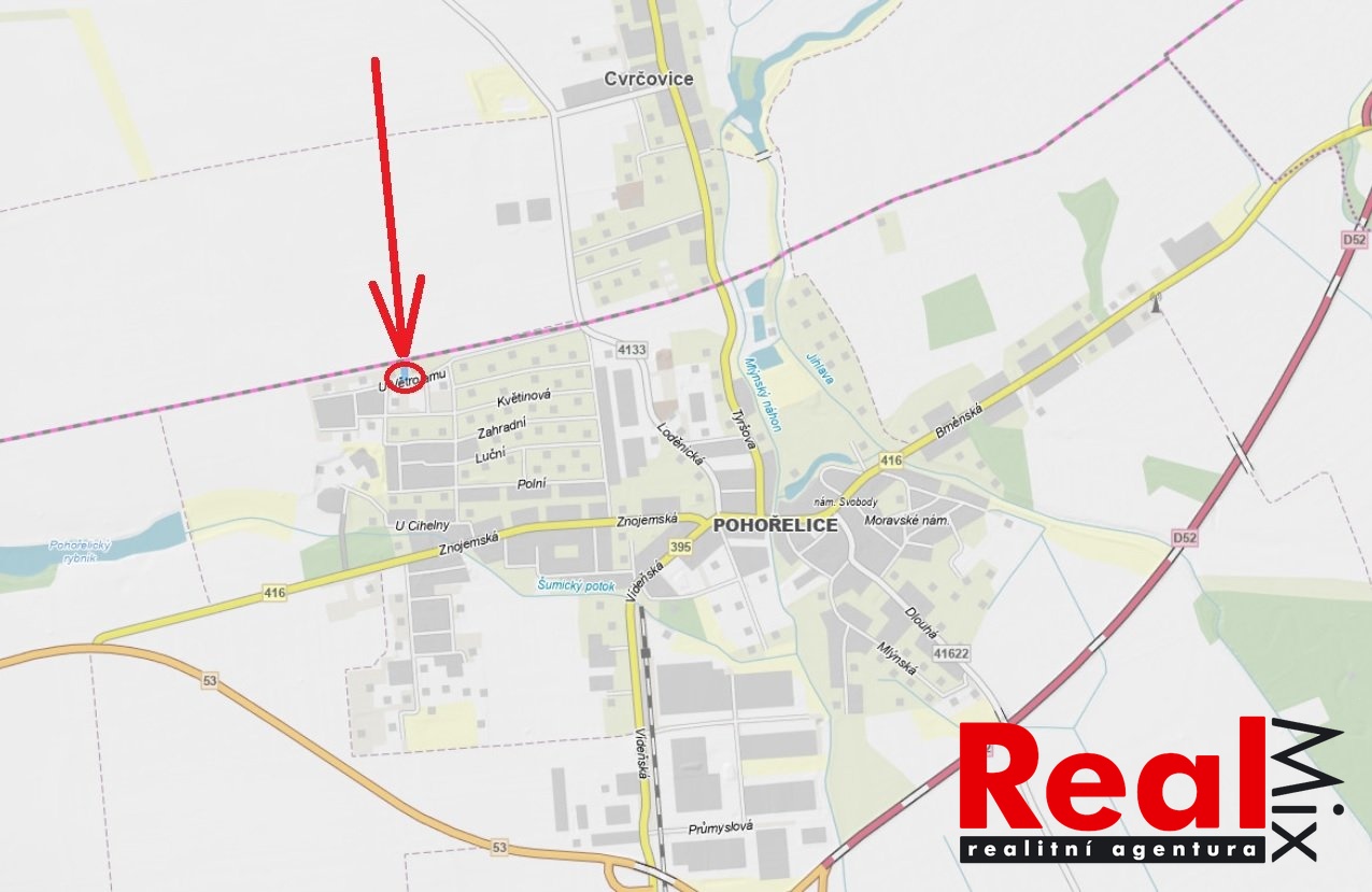 Prodej pěkného a rovinatého stavebního pozemku o výměře 846m2 v obci Pohořelice, okres Brno - venkov. Pozemek má obdélníkový tvar s uliční šířkou 20,5m a délkou 42m. Parcela je určena pro stavbu samostatně stojícího rodinného domu. Inženýrské sítě na hranici pozemku - voda, kanalizace, elektřina; plyn není. Pozemek se nachází v klidné, nově vybudované, neprůjezdné ulici U Větrolamu s přístupem z přední i zadní části pozemku. Dle platného územního plánu je pozemek zařazen do kategorie: Plochy bydlení v rodinných domech. Z obce výborná dostupnost do Brna autem po dálnici cca 15-20 minut jízdy. V obci kompletní občanská vybavenost (MŠ, ZŠ, sportovní areál, supermarkety a další služby). Více info v RK.