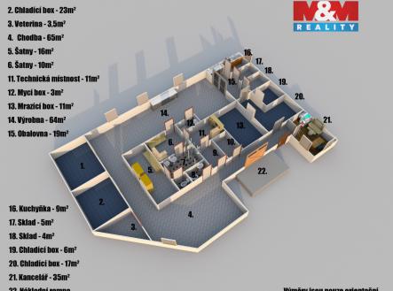 Nabízíme k prodeji výrobní objekt o užitné ploše 377 m2, který se nachází v obci Potvorov, okr. Plzeň-sever. Budova a prostory sloužily ke kompletnímu zpracování zvěřinového masa. Objekt je vybaven k tomuto nebo podobnému účelu a má všechny hygienické a veterinární certifikáty (Cztko, HACAP, veterinární audity vždy v pořádku). Je možné koupit i s firmou, která objekt a zpracování provozuje. Možnost využít jako univerzální skladové prostory nebo skladování termolabilního zboží. Součástí budovy je kancelářský prostor, expediční místnost, expediční chladící box, dva velké chladící boxy, mrazák, výrobní hala s bourárnou, kuchyňka, čistá/špinavá šatna, sprchy + WC, sklad technických prostředků, nerezové bezdotykové baterie, nerezové vybavení bourárny a další vybavení. Objekt je napojen na veřejný vodovod a odpad sveden do jímky (je možno napojit na veřejnou kanalizaci). Kancelář a šatny jsou vytápěny el. přímotopy a ohřev vody bojlerem. Rozloha pozemku je 603 m2. CENA K JEDNÁNÍ!